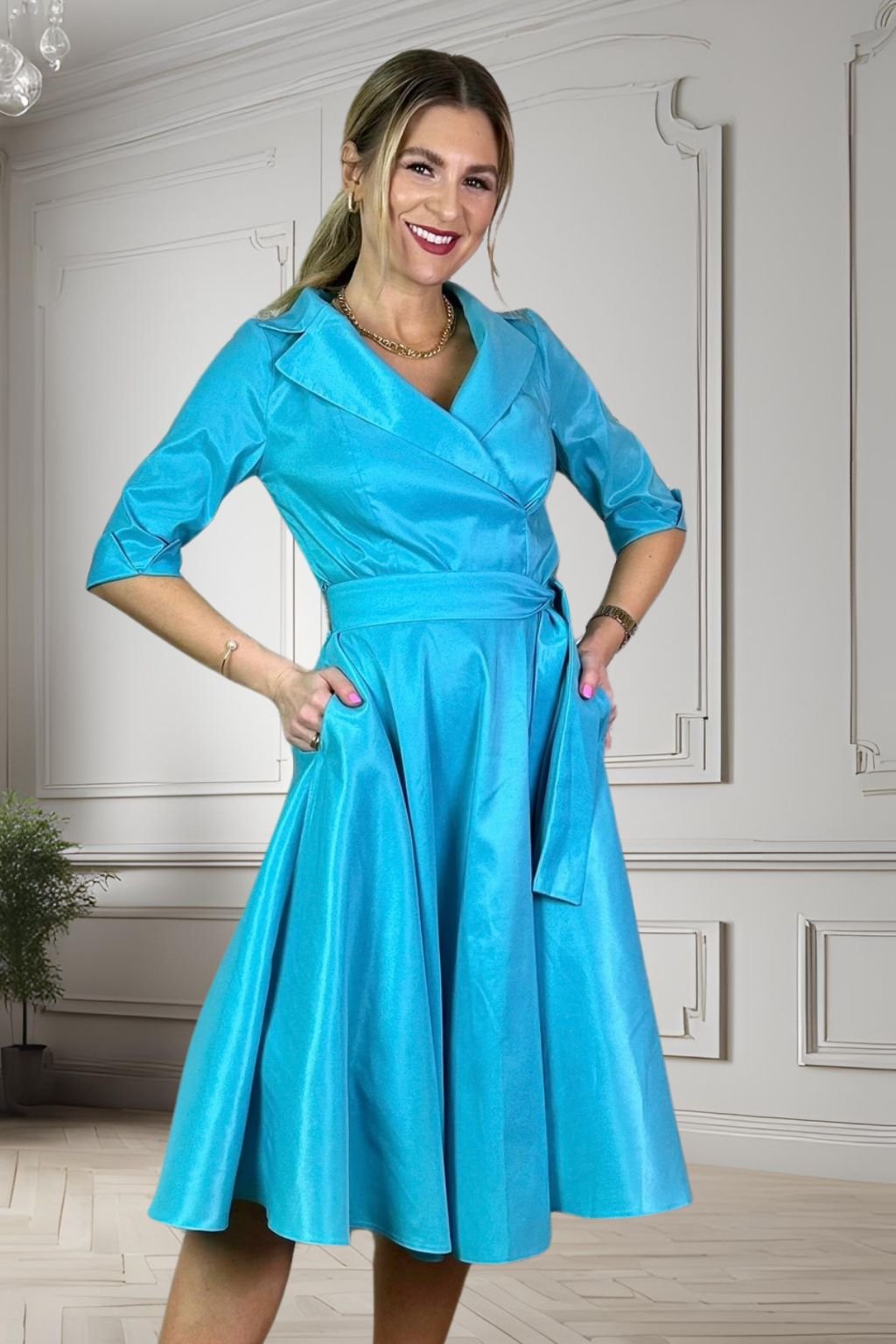 Azúrovo-modré šaty áčkového strihu, so spodničkou a s vreckami. K šatom je opasok v tej istej látke.