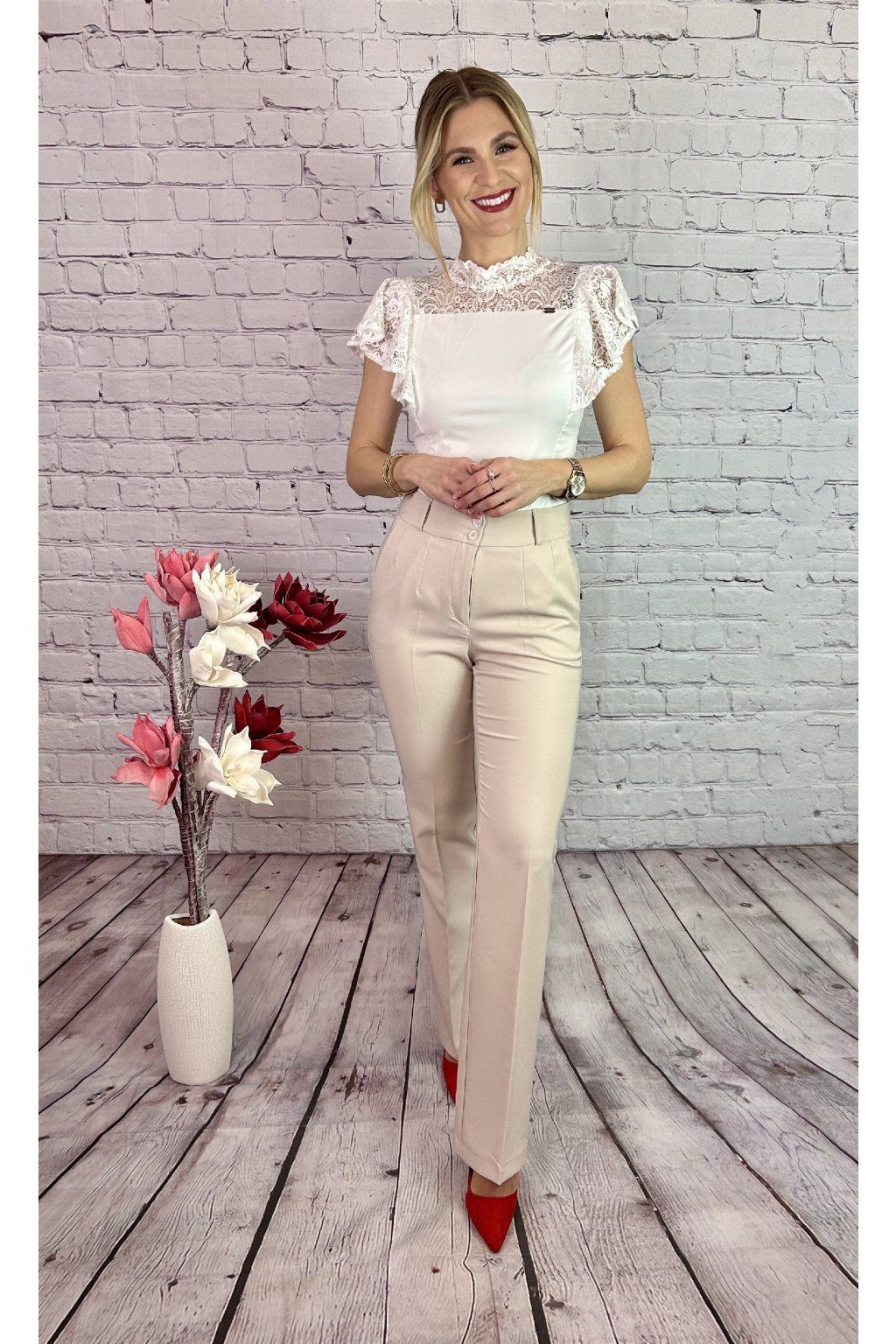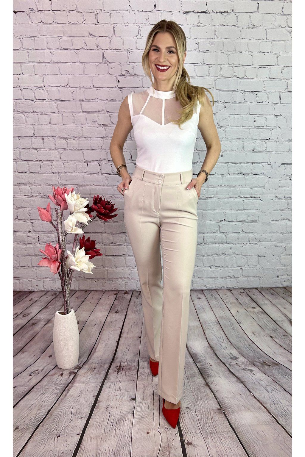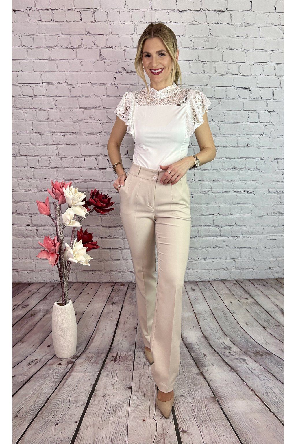 Béžové nohavice sú s mierne vyvýšeným sedom, s vreckami po bokoch a dolu mierne rozšírené. Materiál je mierne elastický.