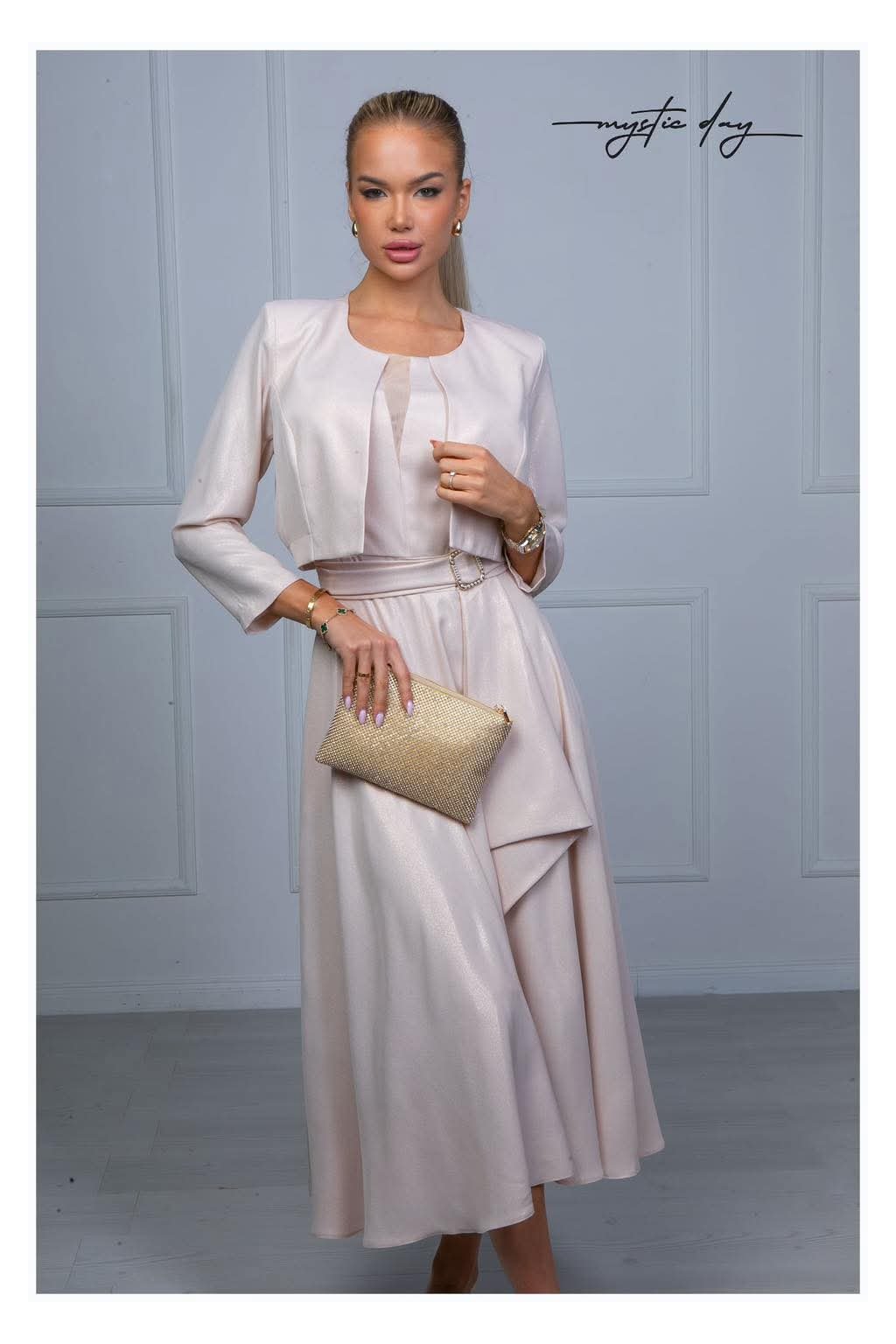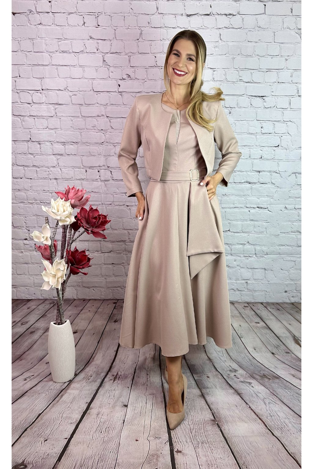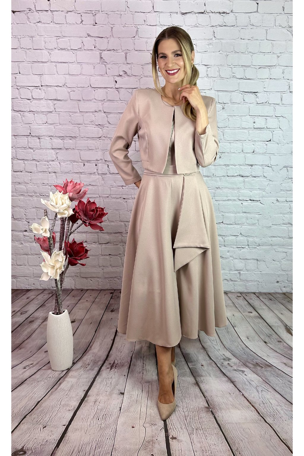 Béžovy kostým. Šaty v MIDI dĺžke v vreckami po bokoch a  ozdobnou perličkovou sponou. Kabátik je v štýle bolerka. Materiál nie je elastický, s jemnými trblietavými odleskmi.