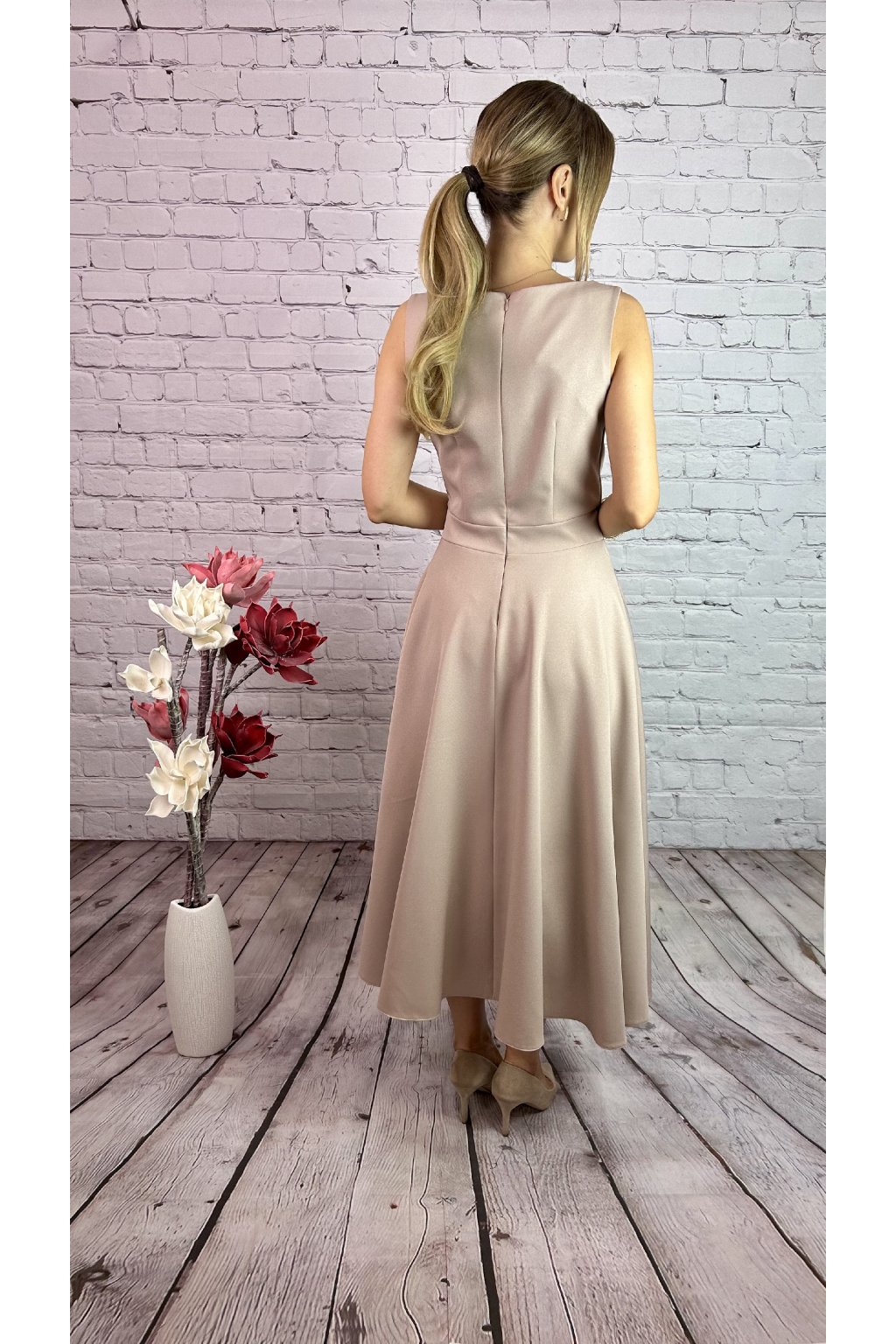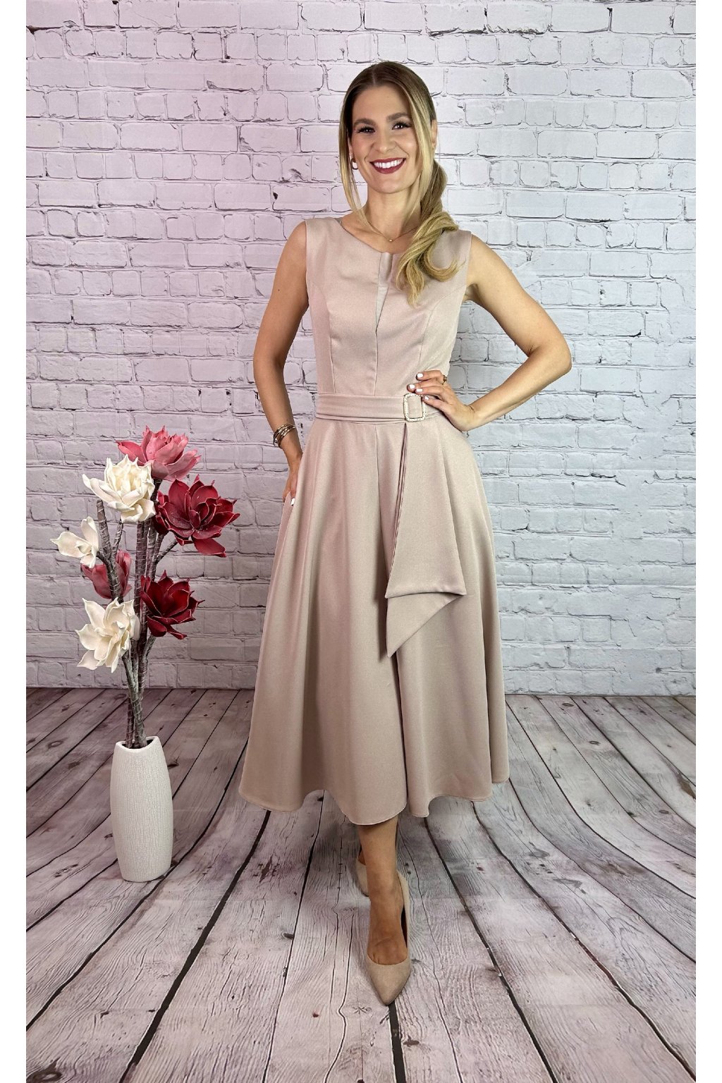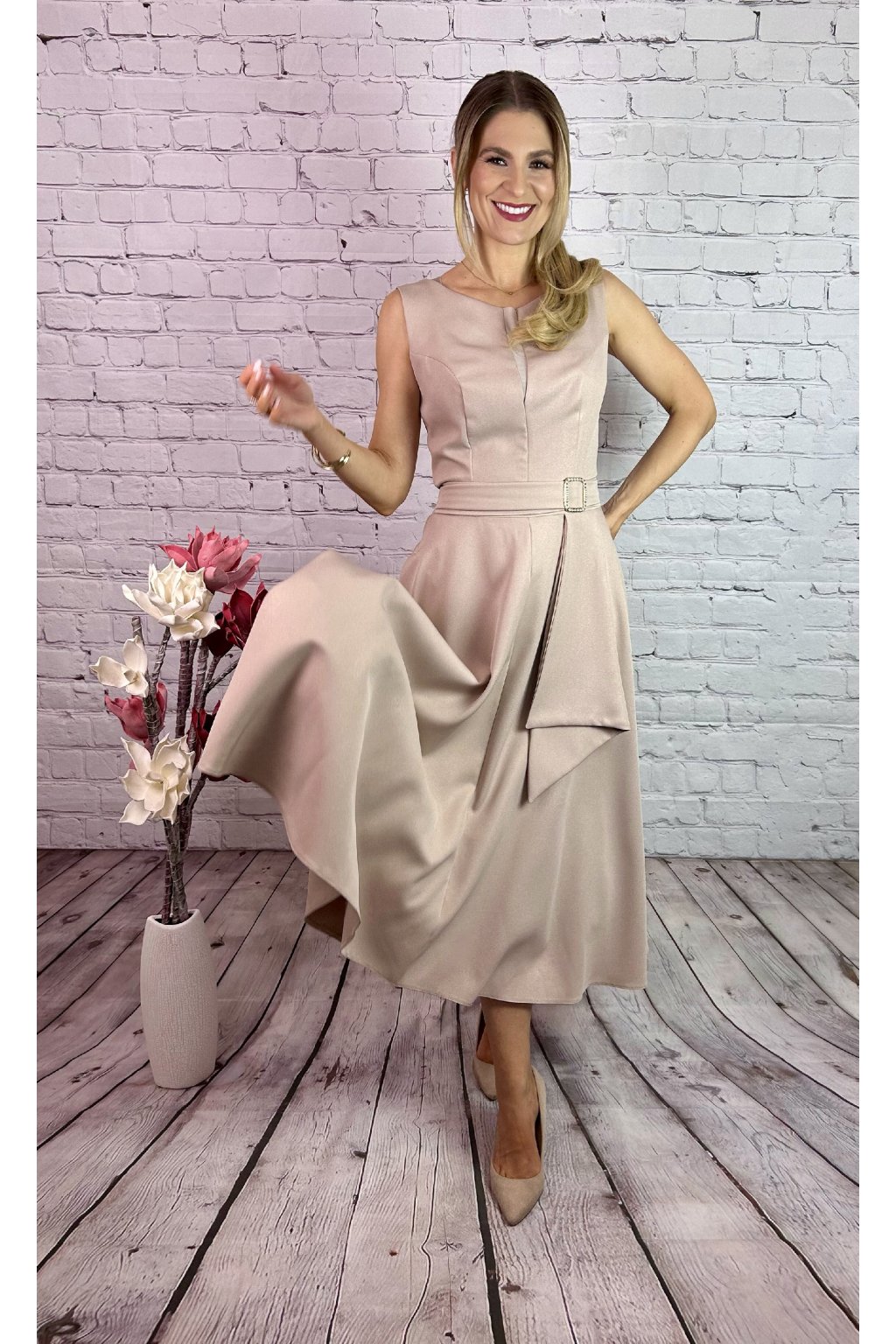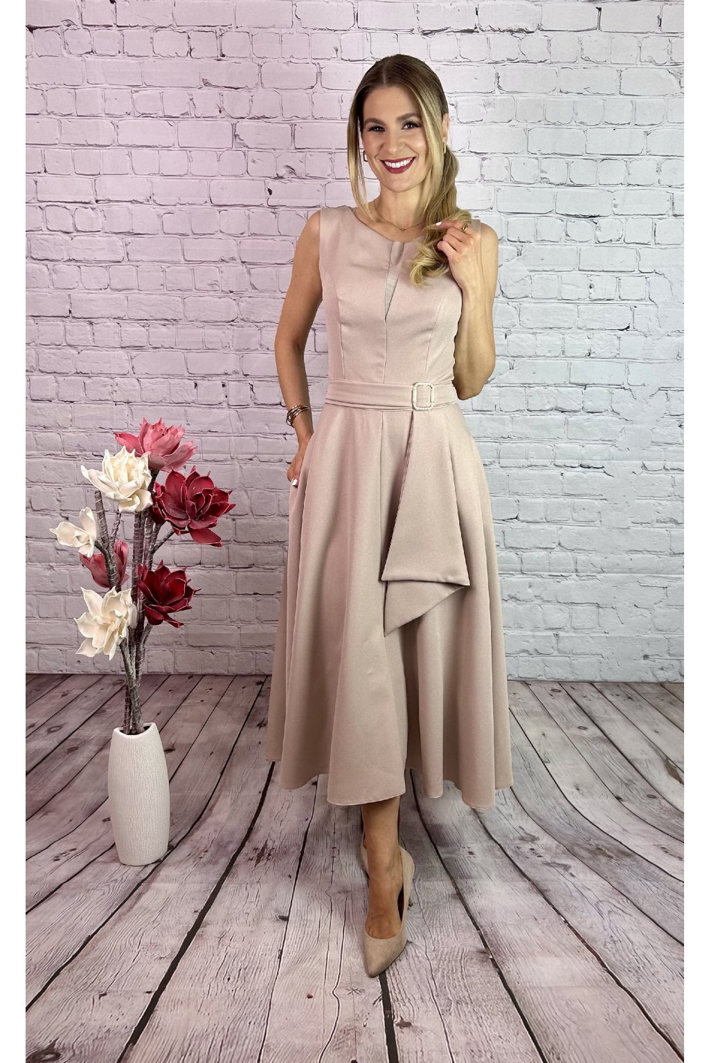 Béžovy kostým. Šaty v MIDI dĺžke v vreckami po bokoch a  ozdobnou perličkovou sponou. Kabátik je v štýle bolerka. Materiál nie je elastický, s jemnými trblietavými odleskmi.