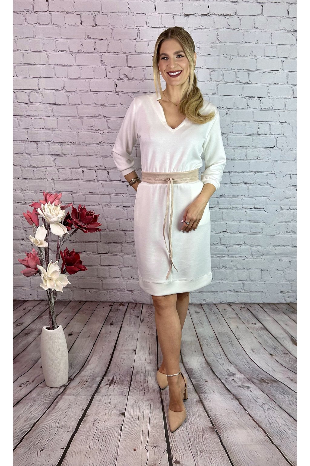 Biele elastické šaty na 3/4 rukáv z hrubšieho mäkkého materiálu. Šaty sú strihané v páse, vrecká po oboch stranách.