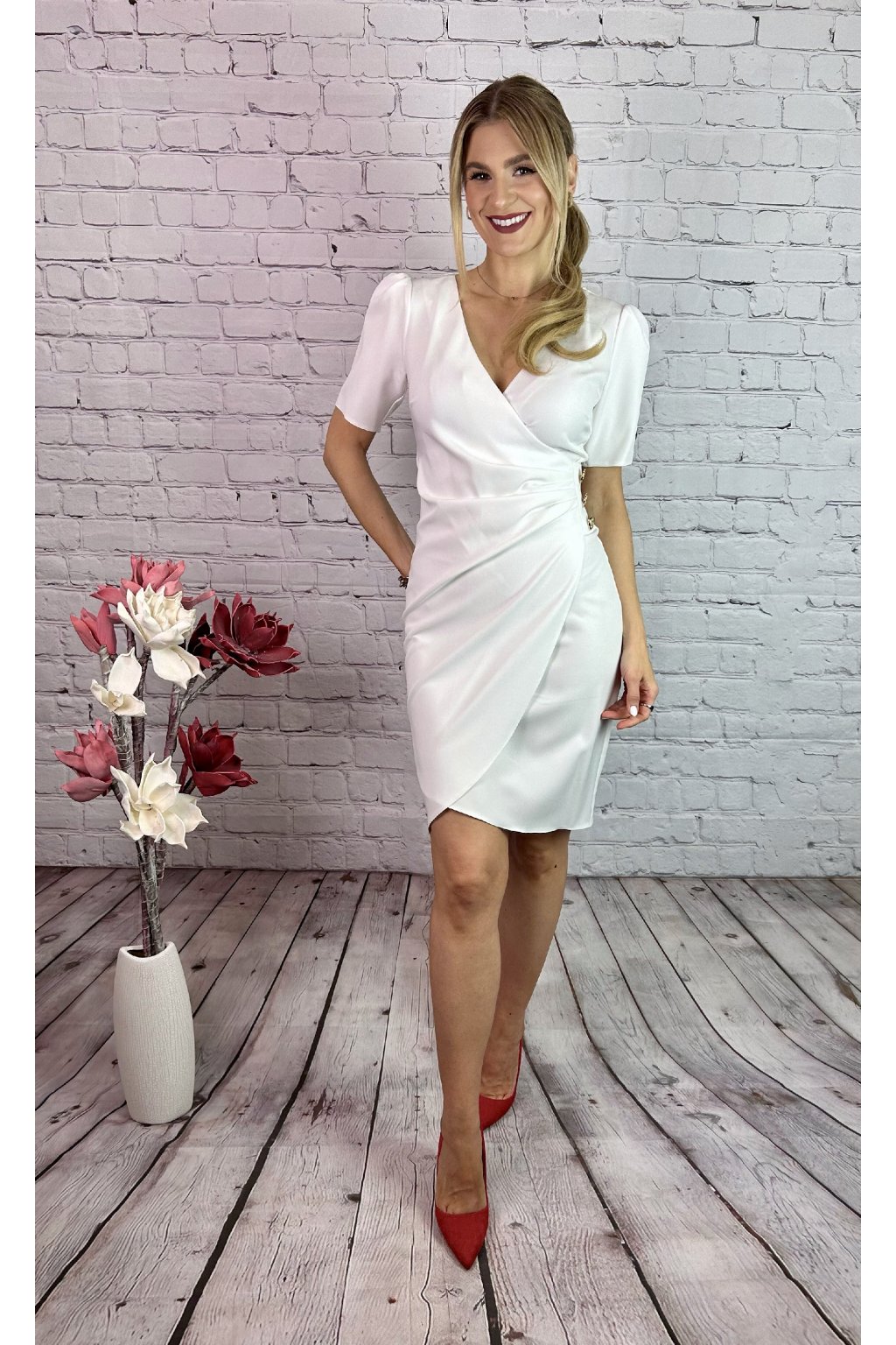 Snehovo biele šaty v puzdrovom strihu, vpredu na brušku nazberané s ozdobnými gombíkmi. Šaty sú vhodné na akúkoľvek príležitosť. Zapínanie vzadu na zips.