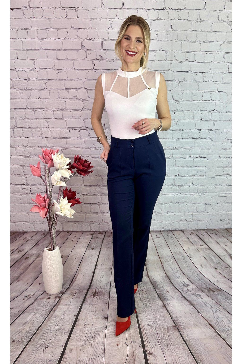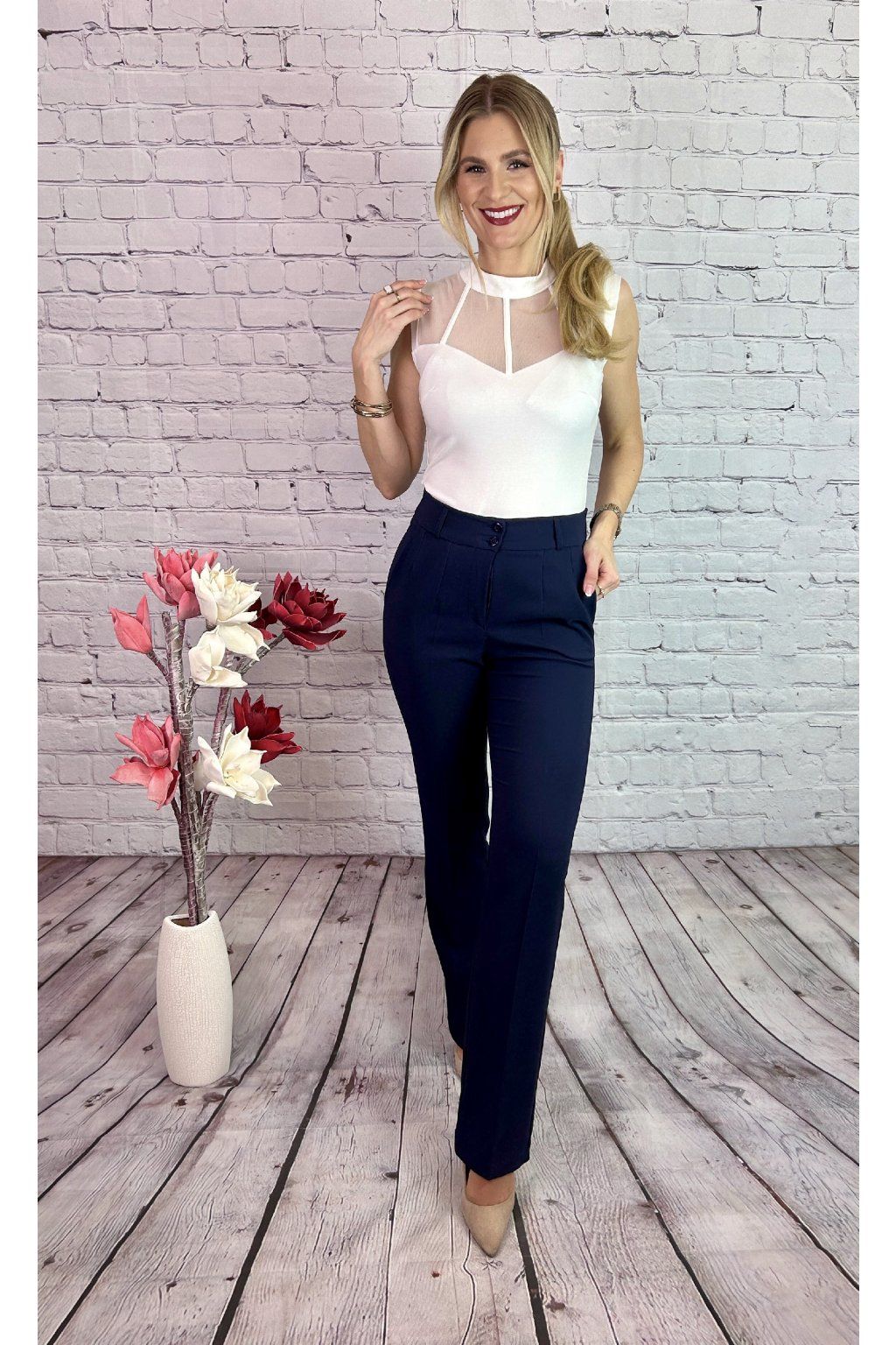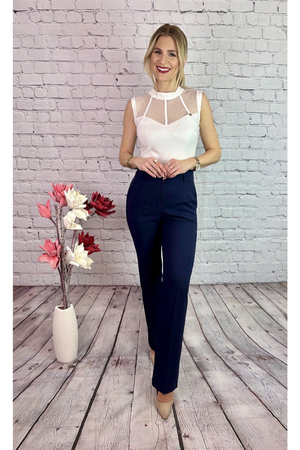 Biely elastický top bez rukávov. Zaujímavý je detail v podobe priehľadnej sieťky v oblasti dekoltu.