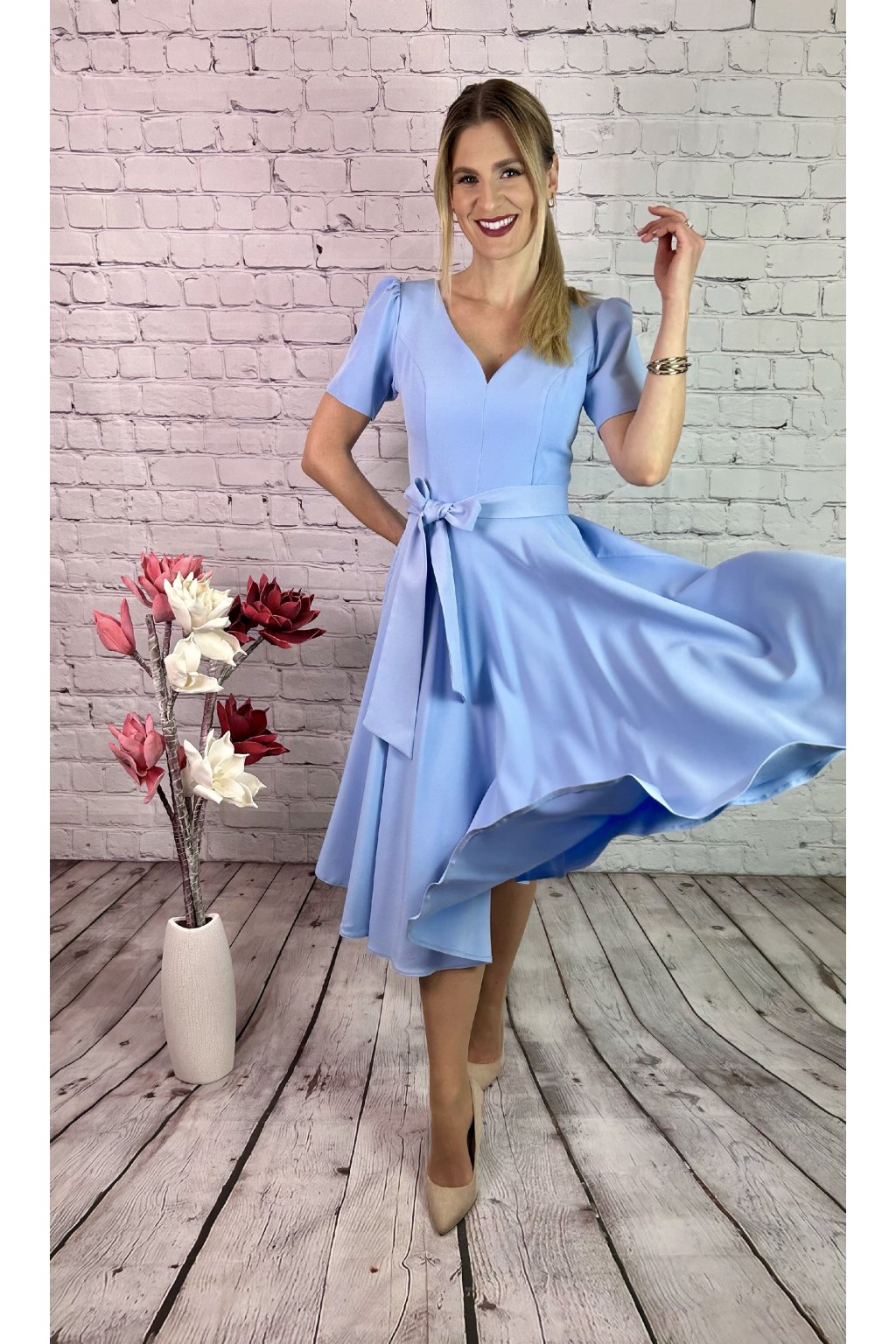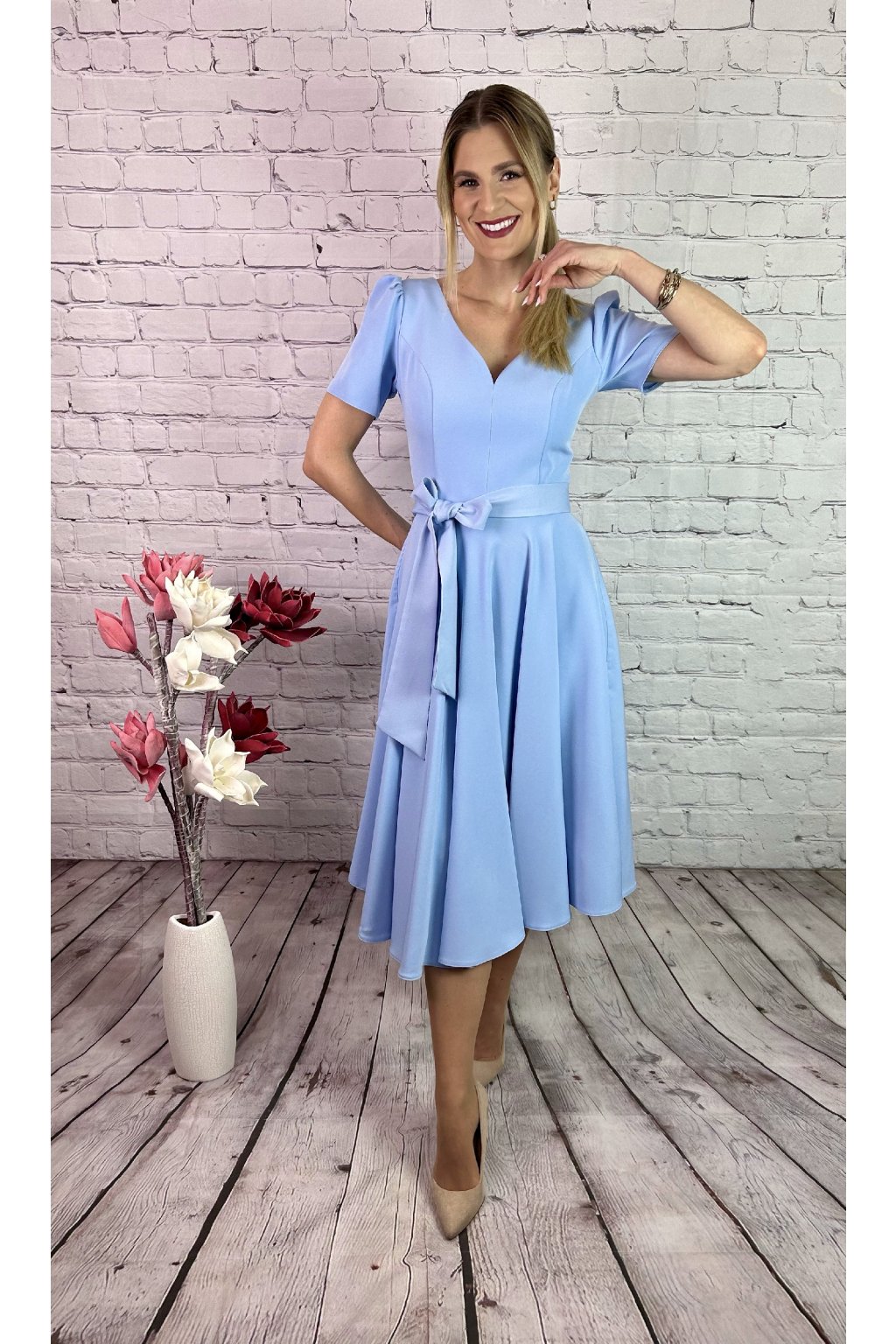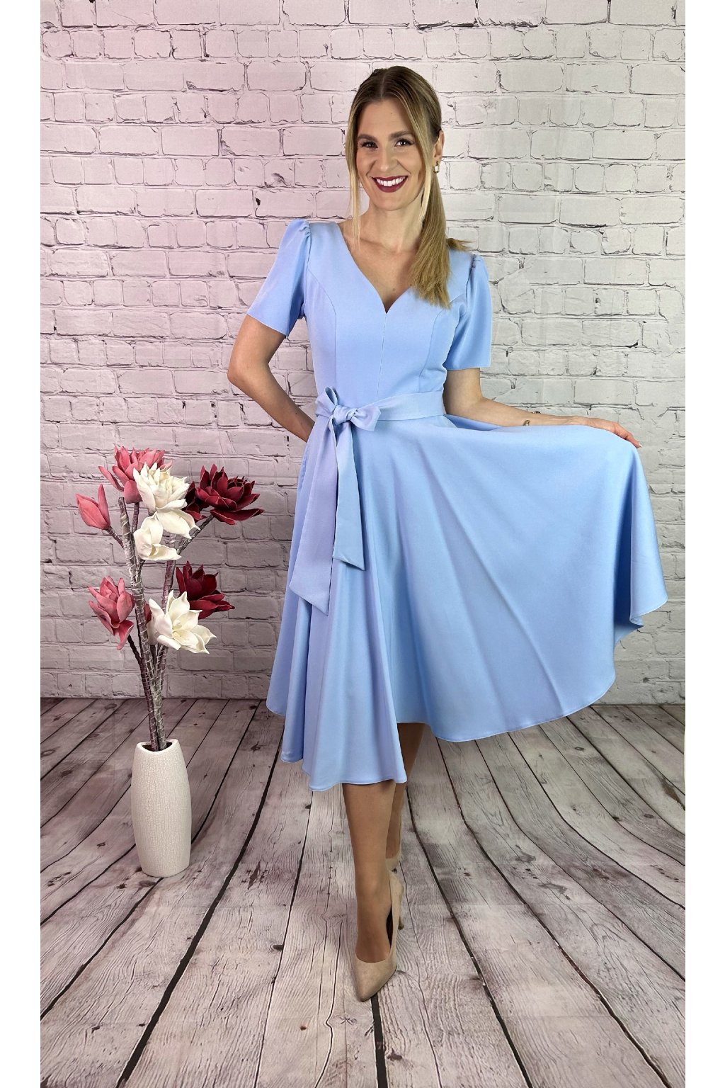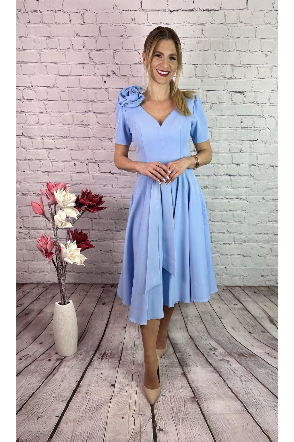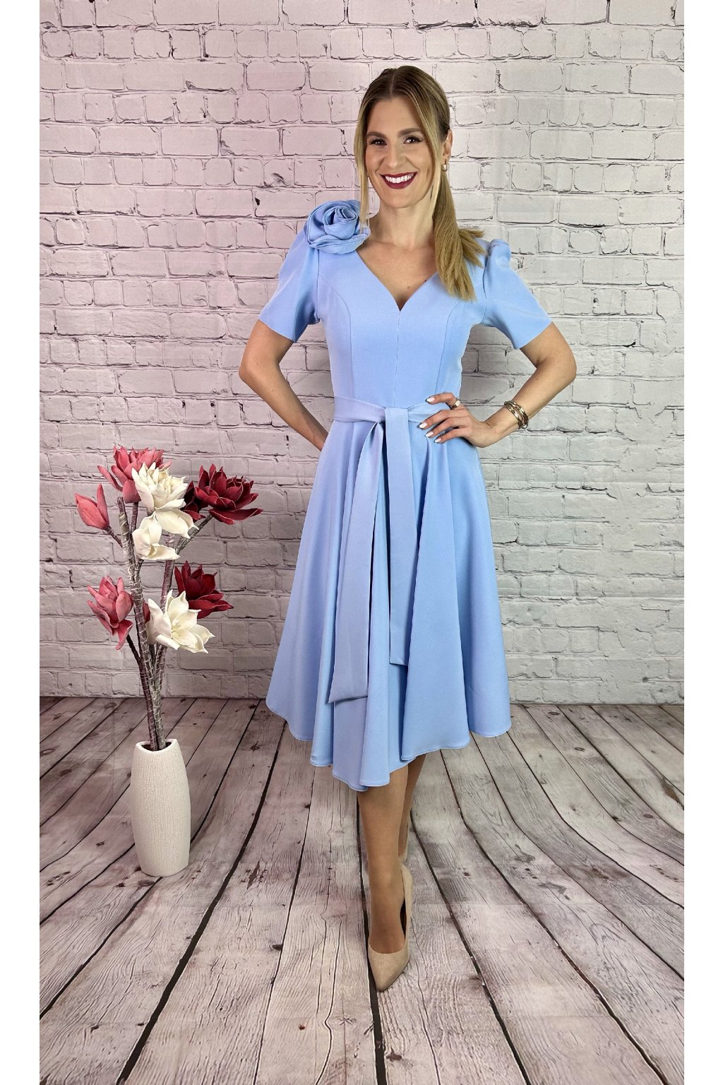 Nádherné MIDI šaty v svetlo modrom odtieni s krátkym rukávom. Sukna je A-strihu, materiál nie je elastický. Zapínanie je vzadu. Súčasťou šiat je snímateľná ruža a opasok. Perfektná voľba na slávnostné príležitosti.