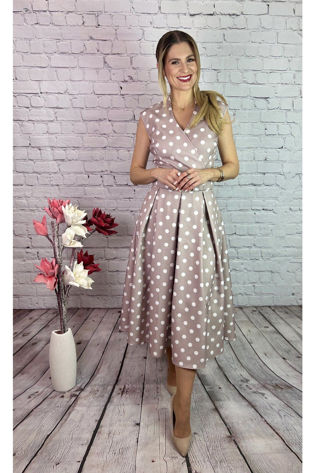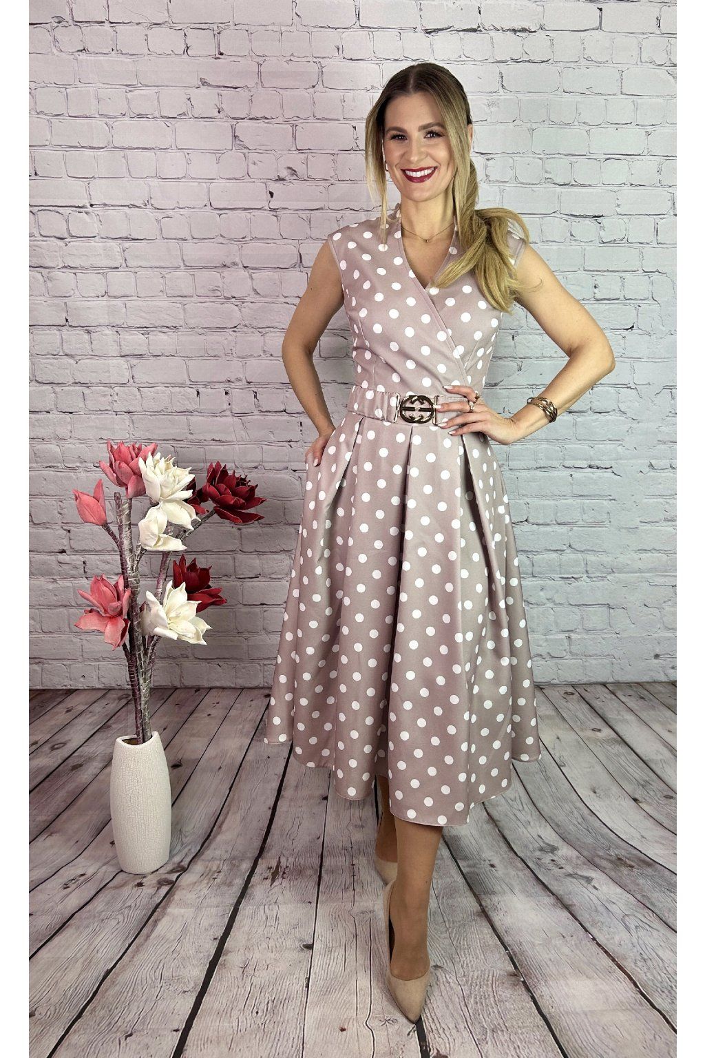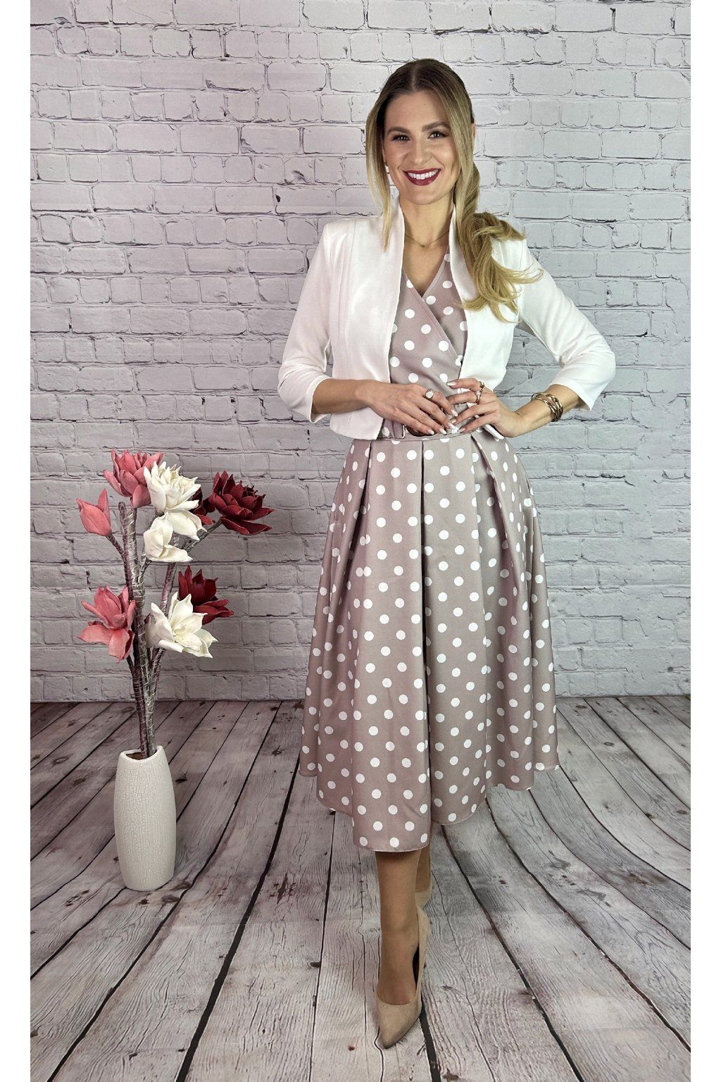 Nádherné bodkované MIDI šaty na béžovom podklade. Šaty sú strihané v páse. Majú ozdobný opasok a vrecká po oboch stranách. Šaty viete kombinovať a doladiť so sakom alebo bolerkom z našej kolekcie.