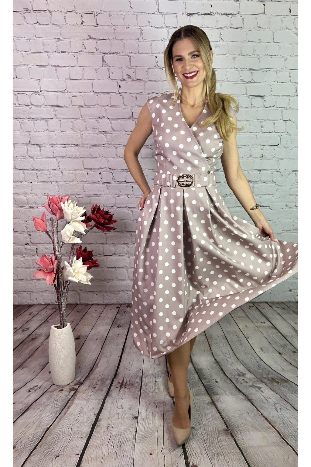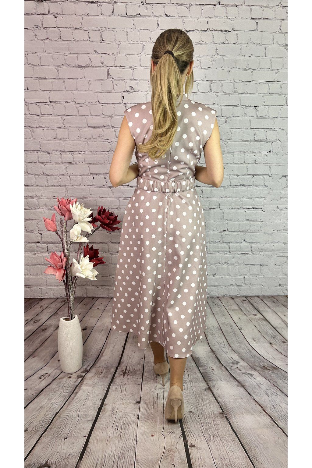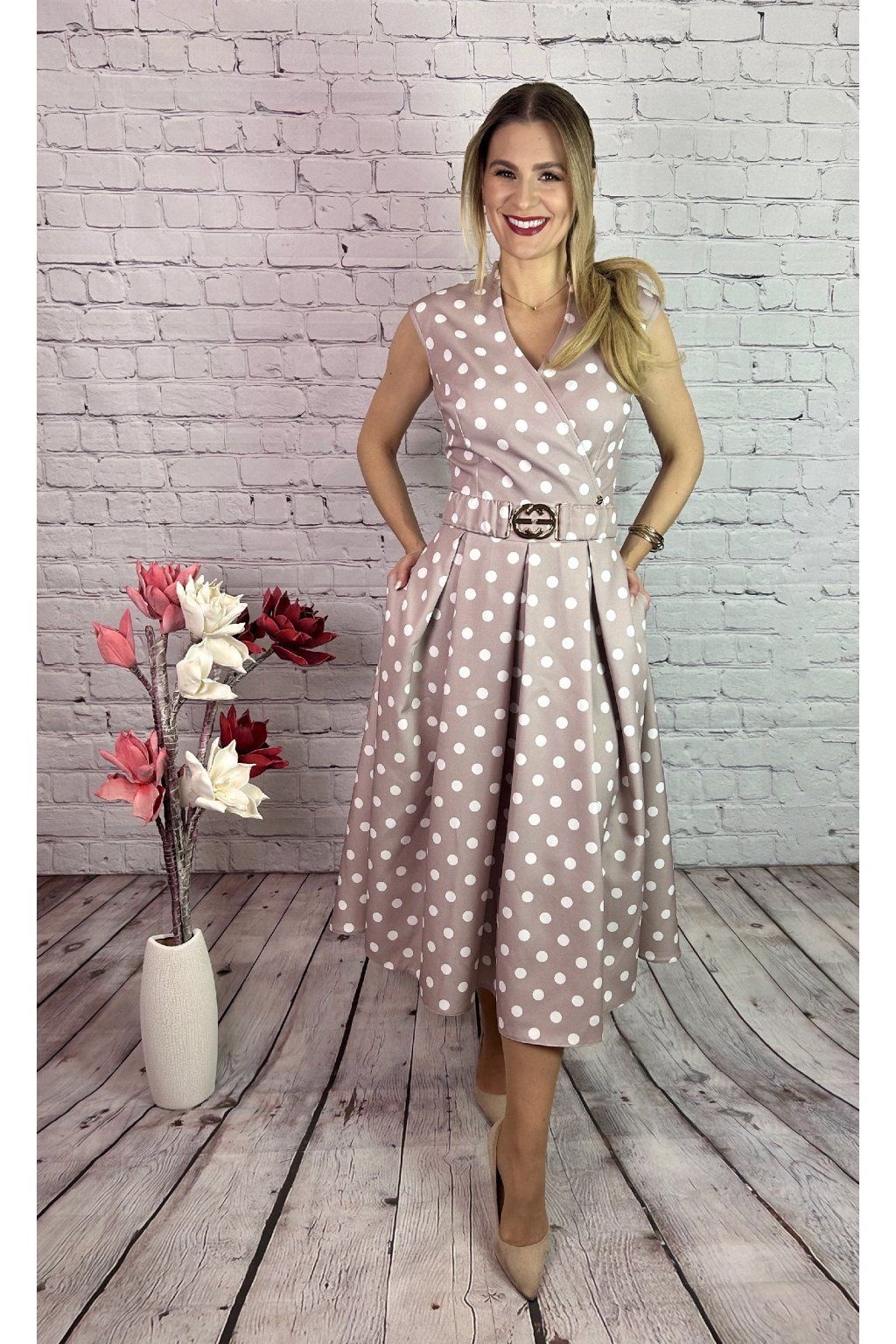 Nádherné bodkované MIDI šaty na béžovom podklade. Šaty sú strihané v páse. Majú ozdobný opasok a vrecká po oboch stranách. Šaty viete kombinovať a doladiť so sakom alebo bolerkom z našej kolekcie.