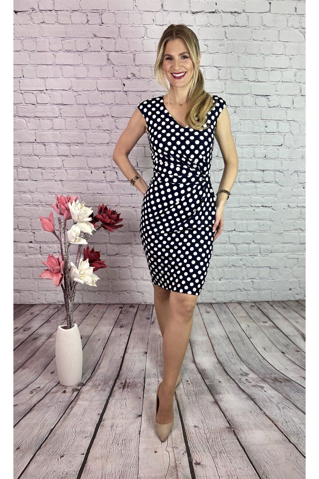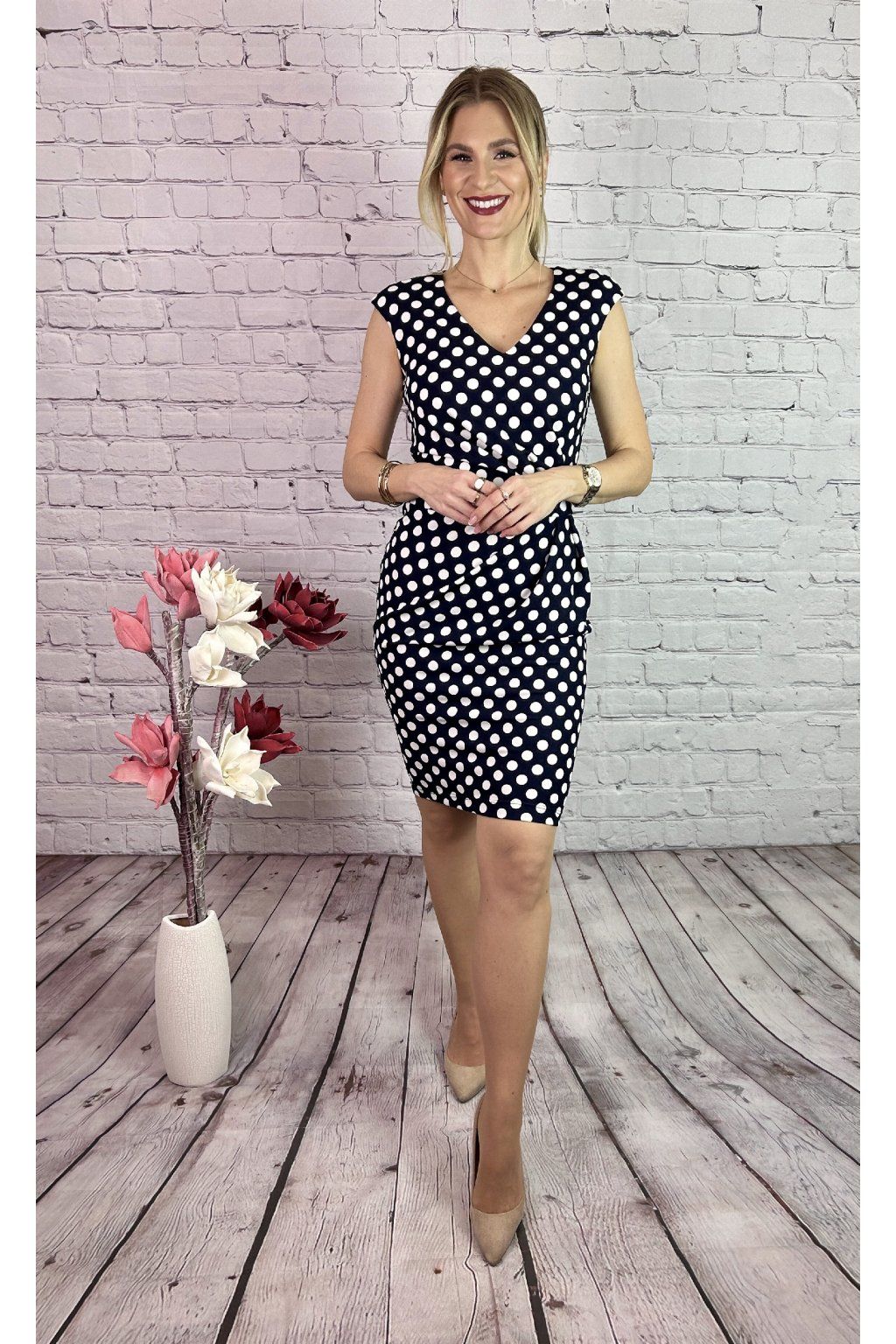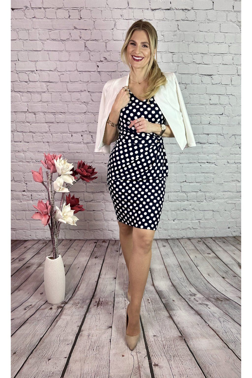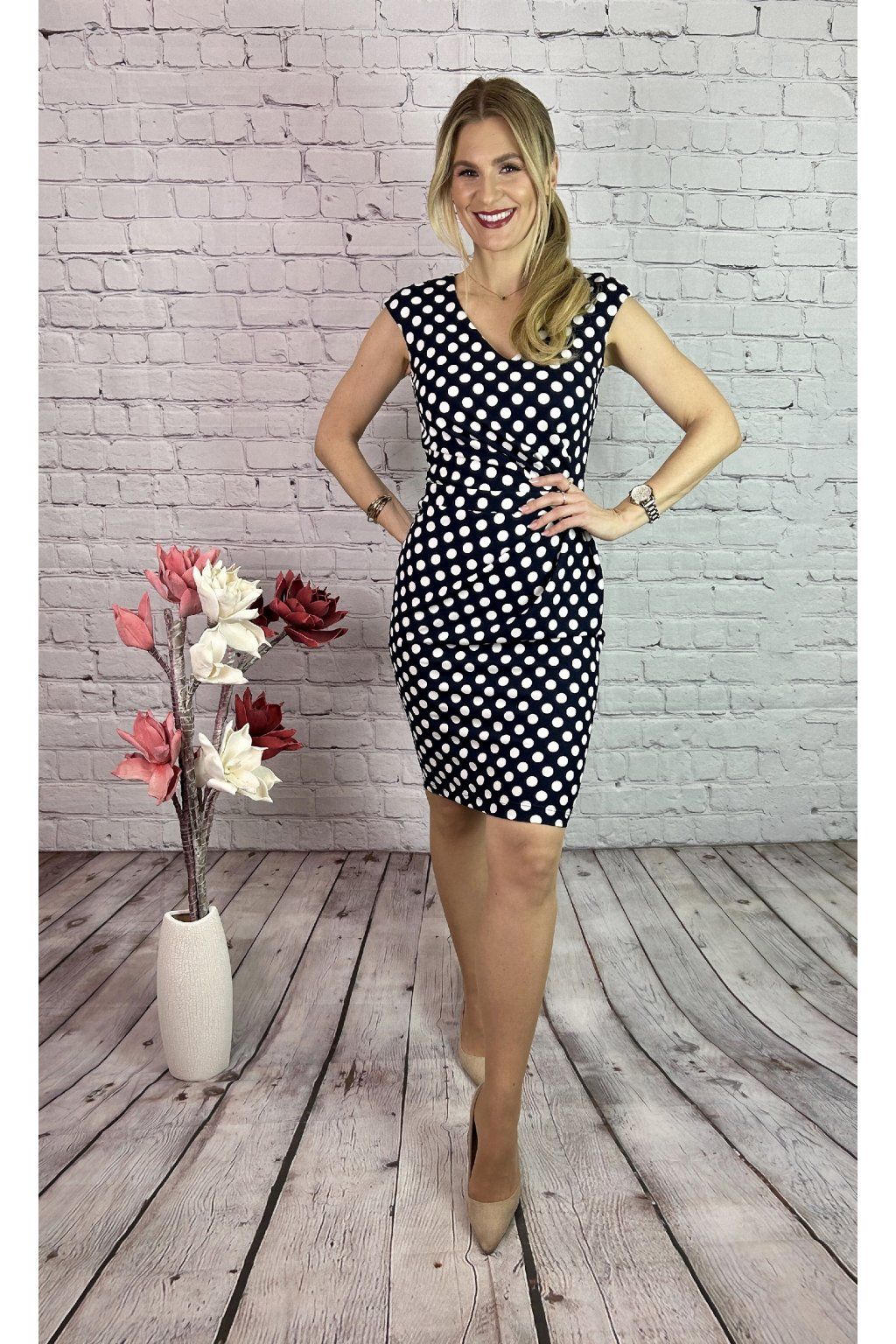 Šaty s bielymi bodkami na tmavomodrom podklade. Materiál je elastický, vzadu na zips. Daladíte bolerkom z našej kolekcie.