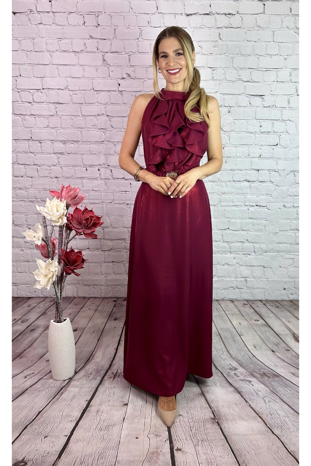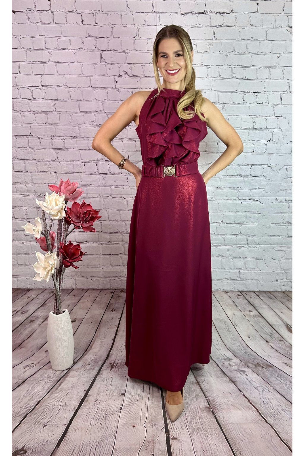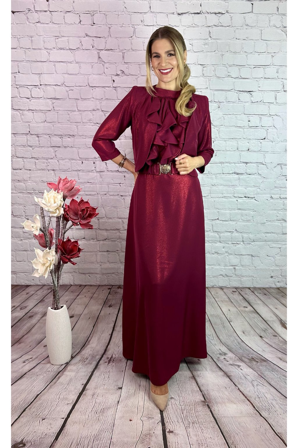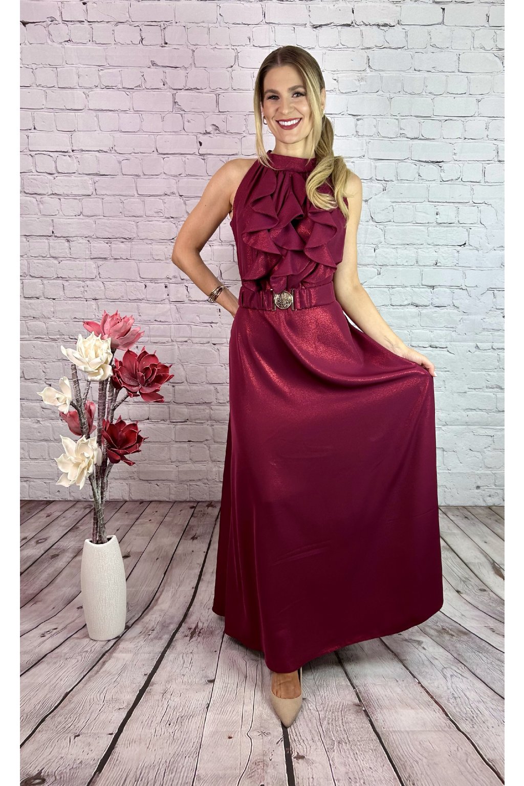 bordové dlhé šaty bez rukávov s ozdobným žabó. Súčasťou šiat je opasok na gumičku s ozdobnou sponou. Zapínanie je v zadnej časti na zips. Suknička je mierneho A-strihu. Súčasťou šiat je aj bolerko.