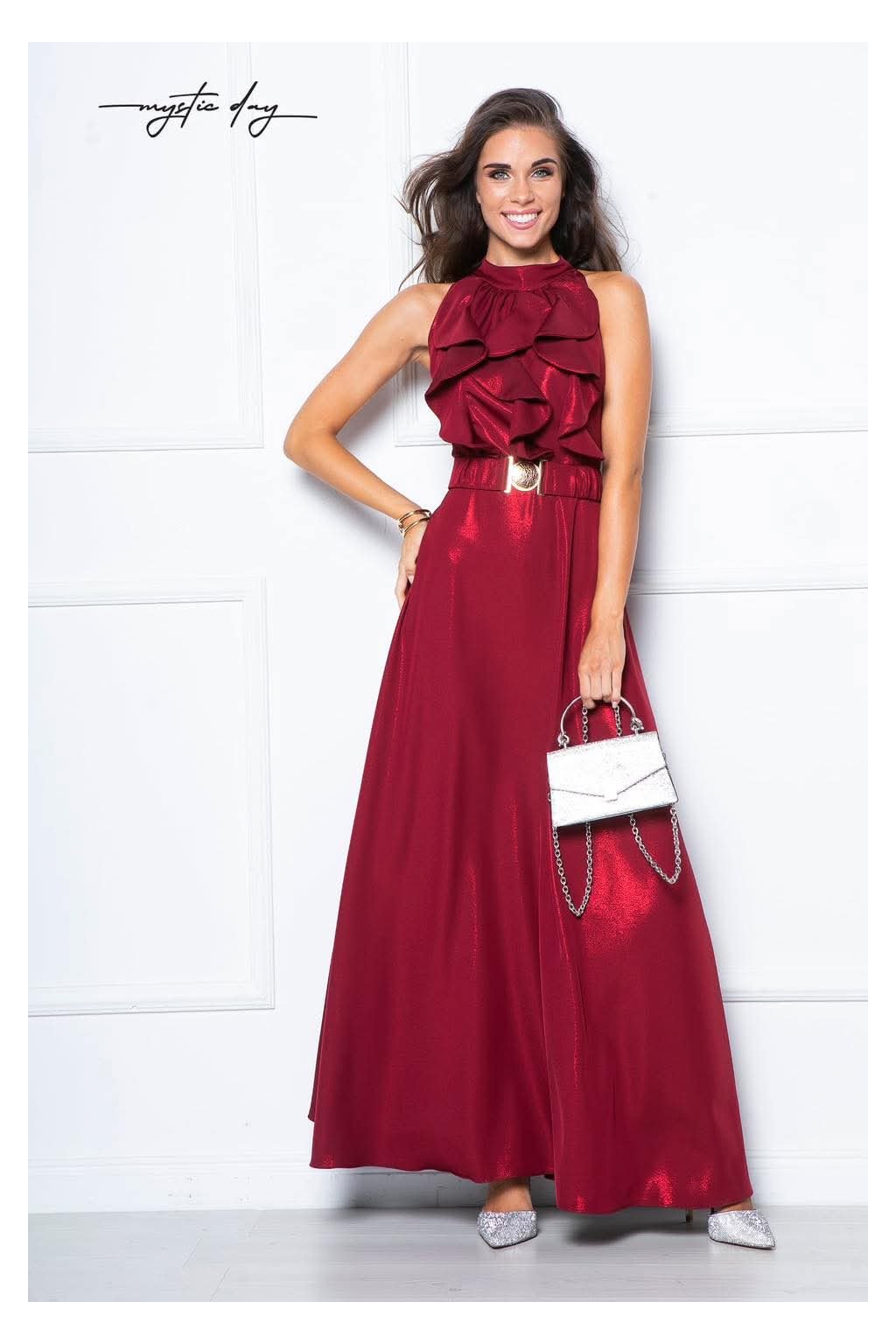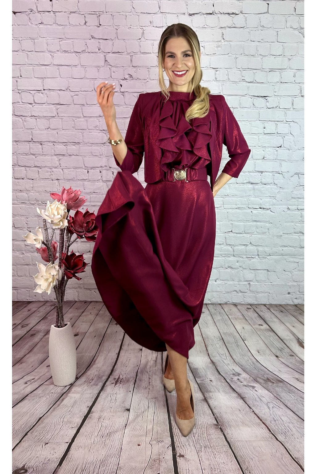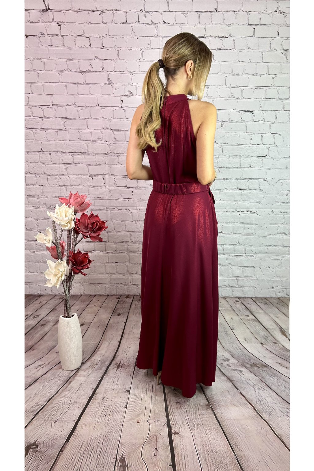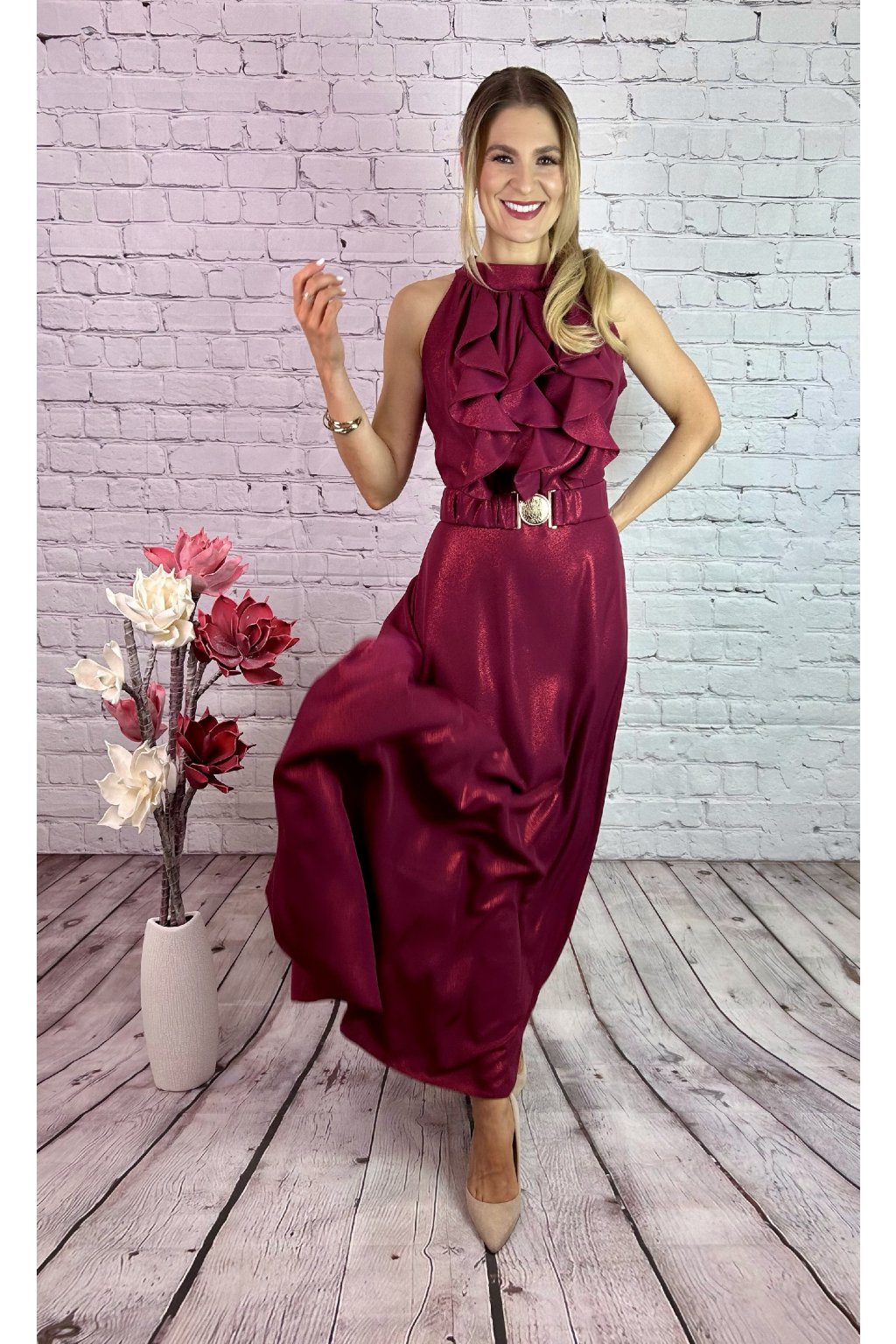 bordové dlhé šaty bez rukávov s ozdobným žabó. Súčasťou šiat je opasok na gumičku s ozdobnou sponou. Zapínanie je v zadnej časti na zips. Suknička je mierneho A-strihu. Súčasťou šiat je aj bolerko.