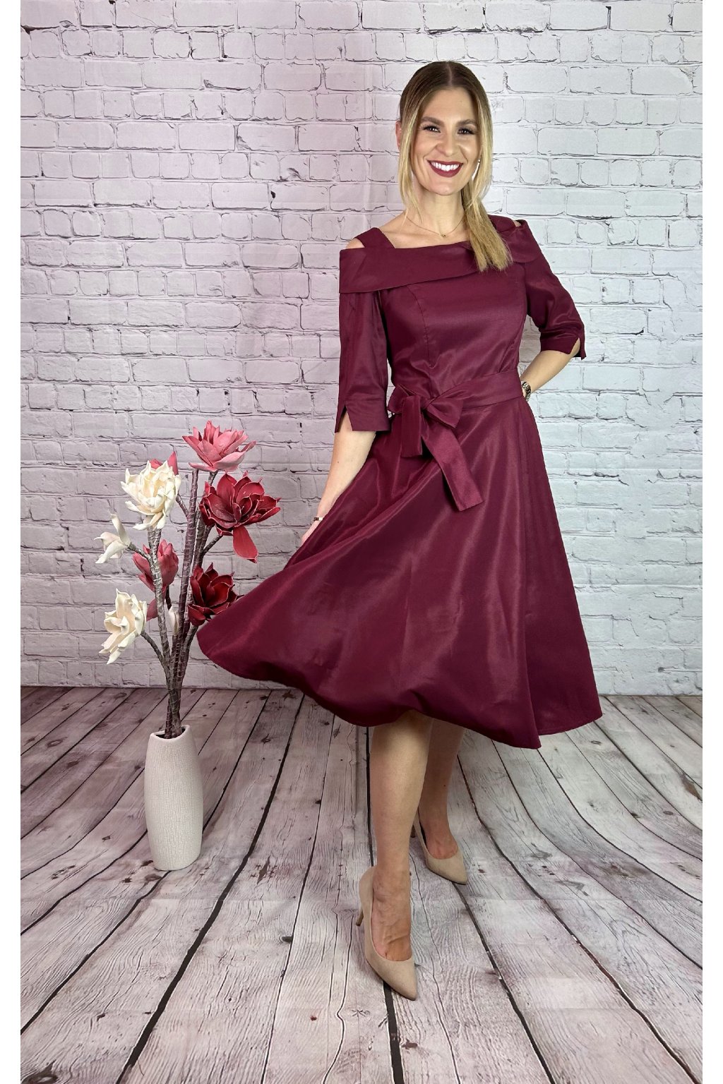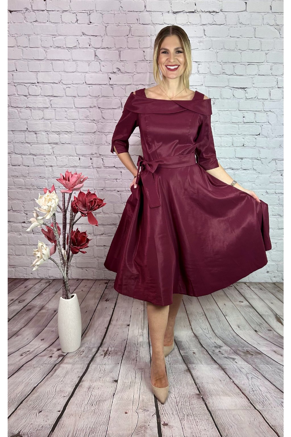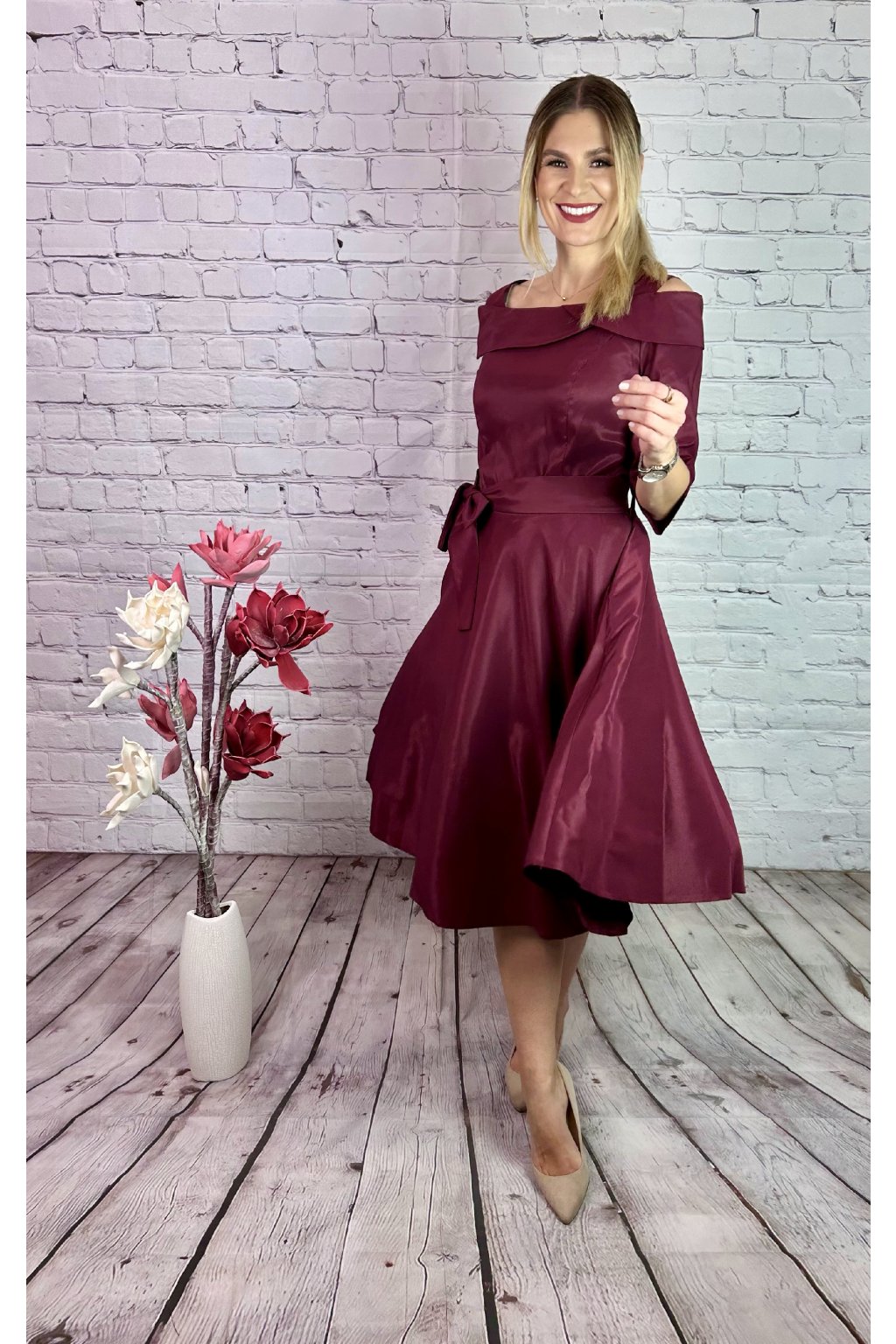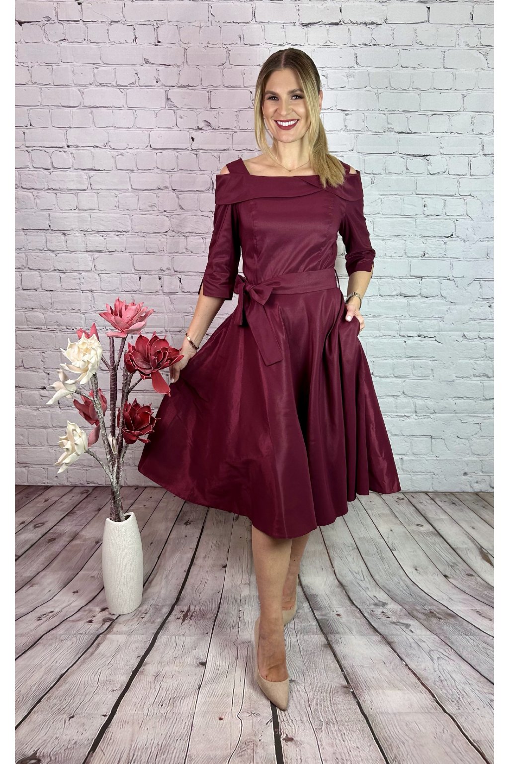 Bordové šaty áčkového strihu s jemným odleskom. Lodičkový výstrih s hrubšími ramienkami na pleciach. Šaty majú spodničku, vrecká  po oboch stranách. Opasok je snímateľný.