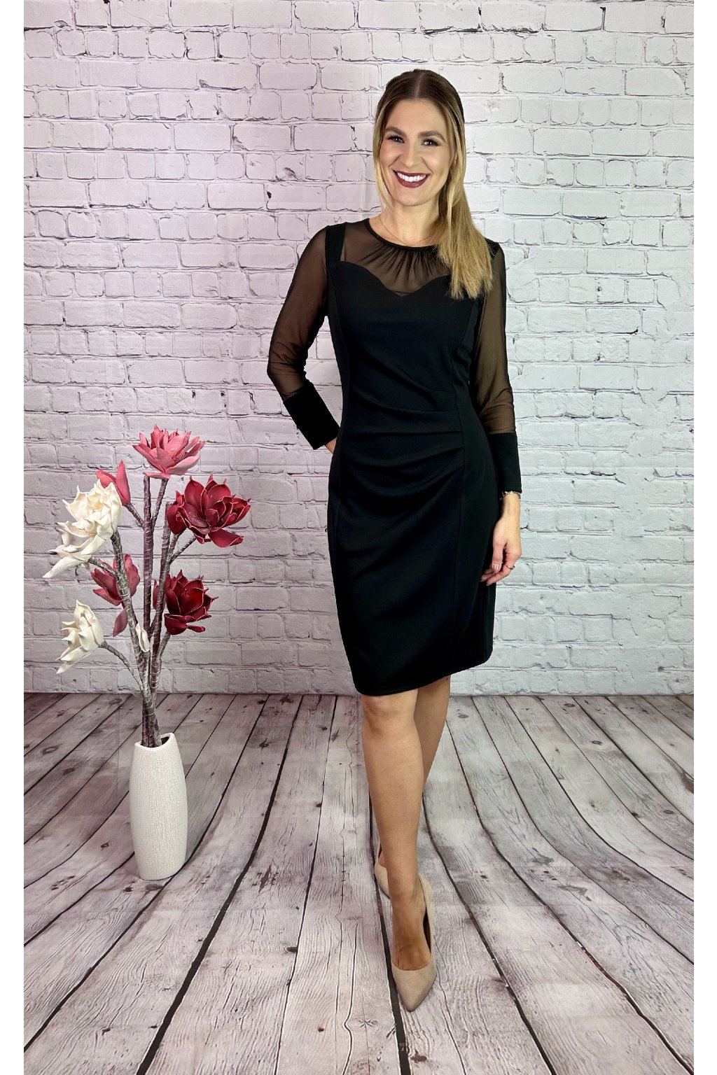 Čierne šaty rovného strihu, dolu mierne sa rozširujúce. Materiál je elastický. Ozdobná sieťka v hornej časti a na rukávoch. Šaty nemaju zips, zapínanie vzadu na krku na viazanie.