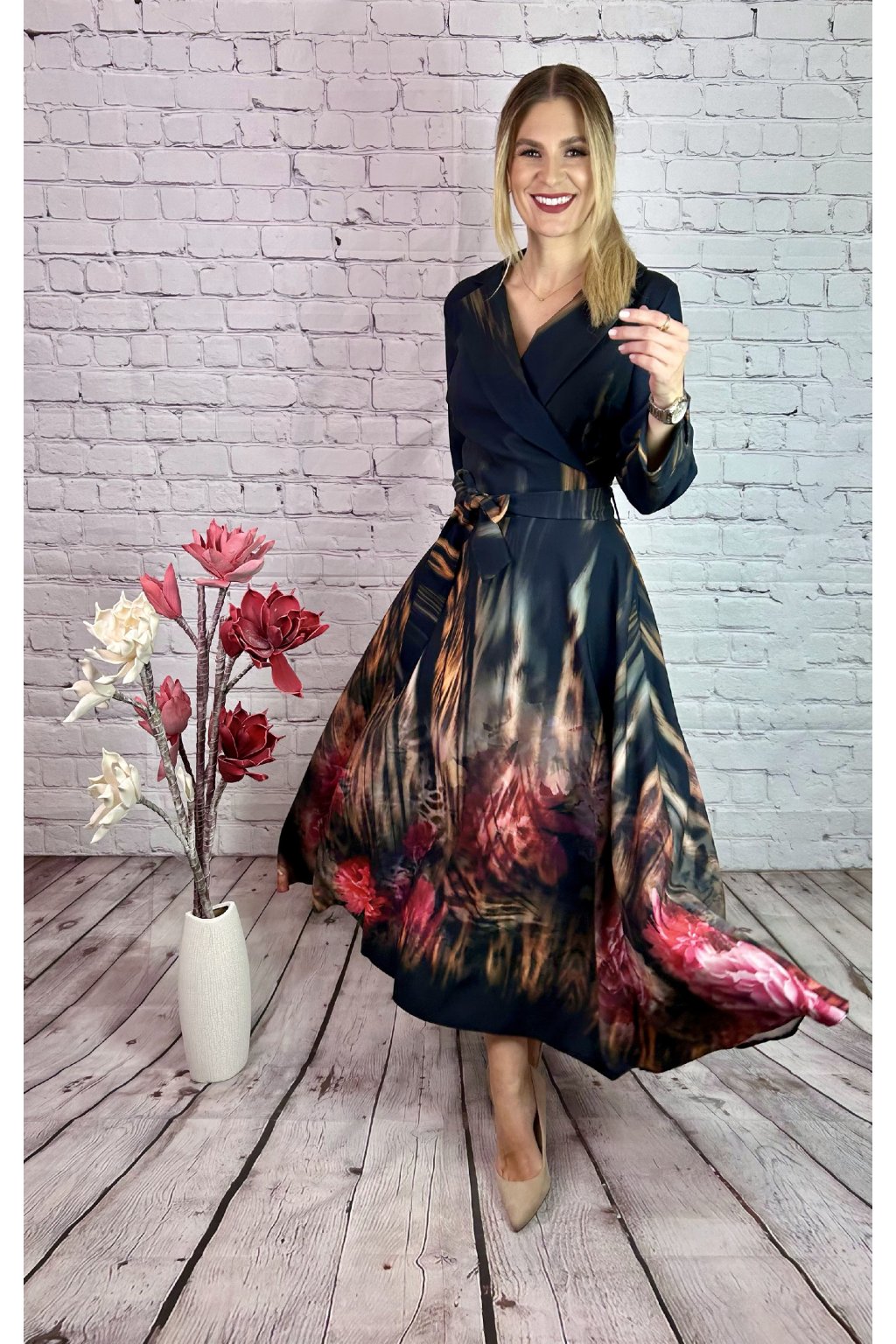 Čierne vzorované MIDI šaty s rukávom. Suknička je A-strihu s krásnou výraznejšou farebnou kvetinovou potlačou. Materiál je mierne elastický. Šaty majú vrecká po oboch stranách, zips na bočnej strane, viazanie v páse.