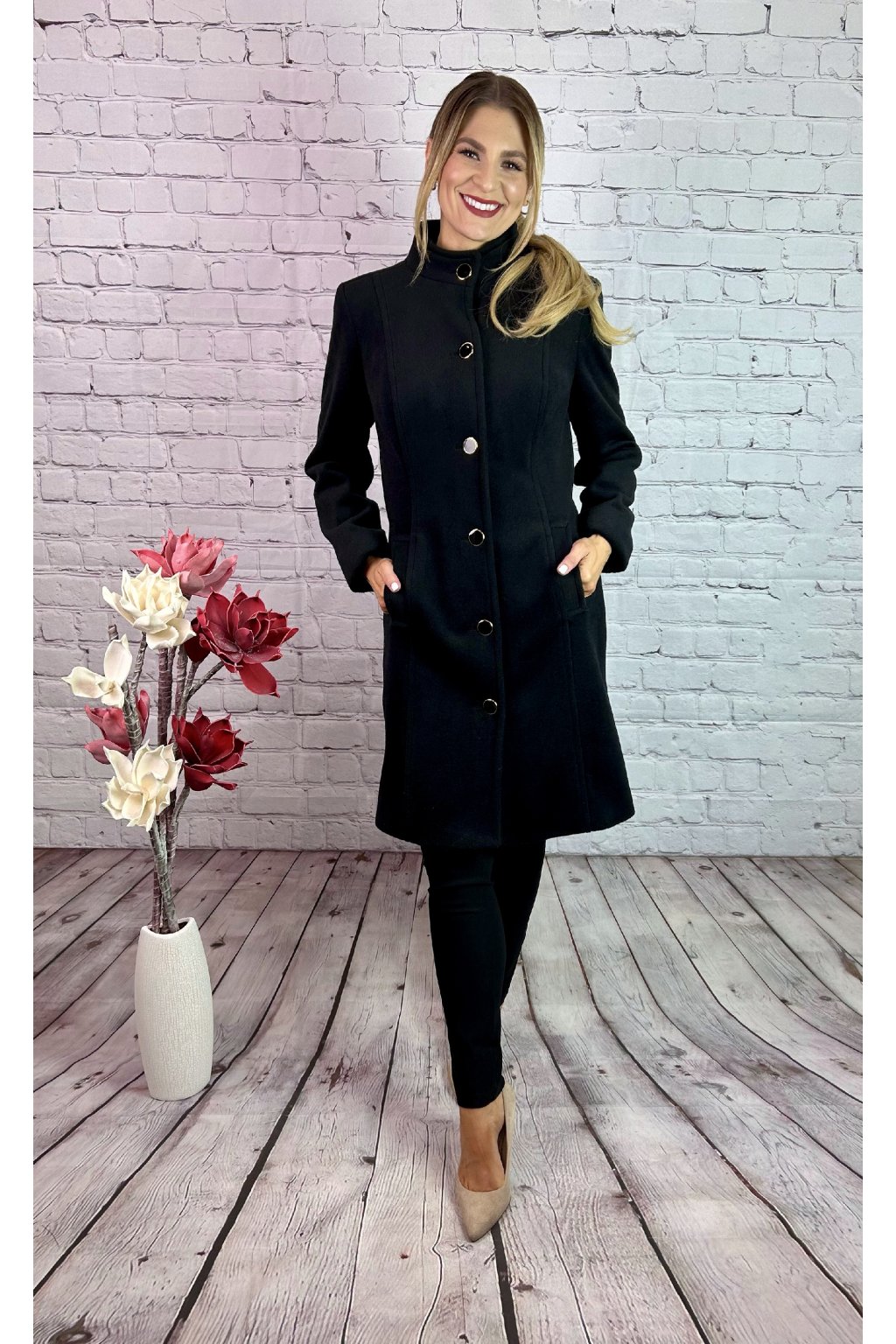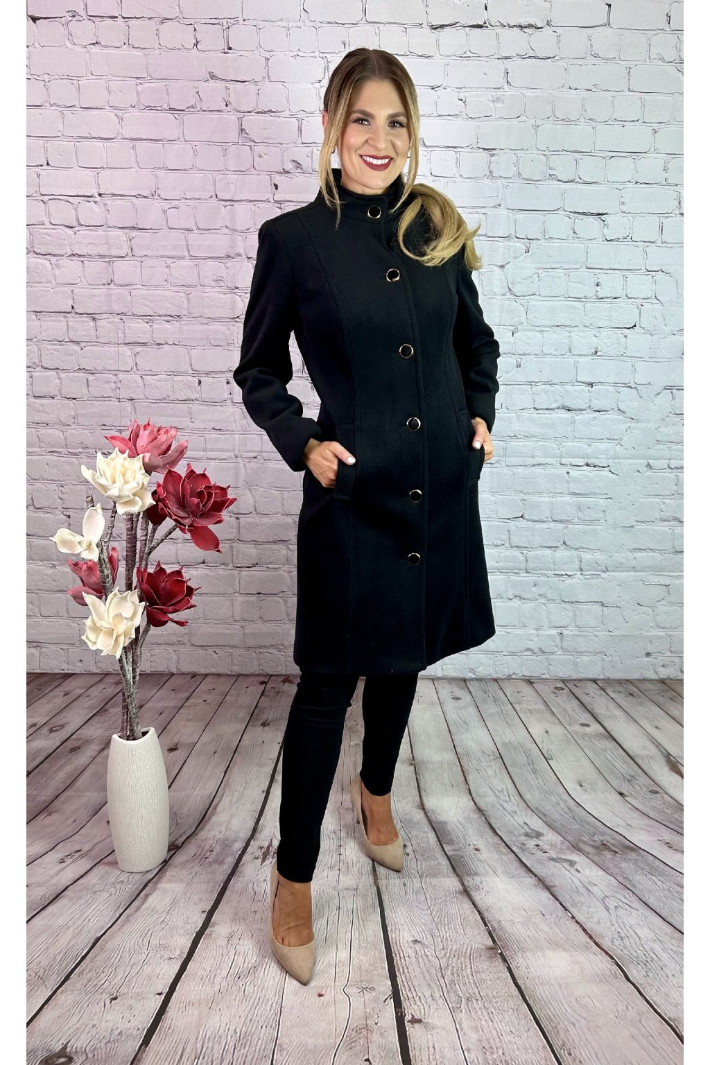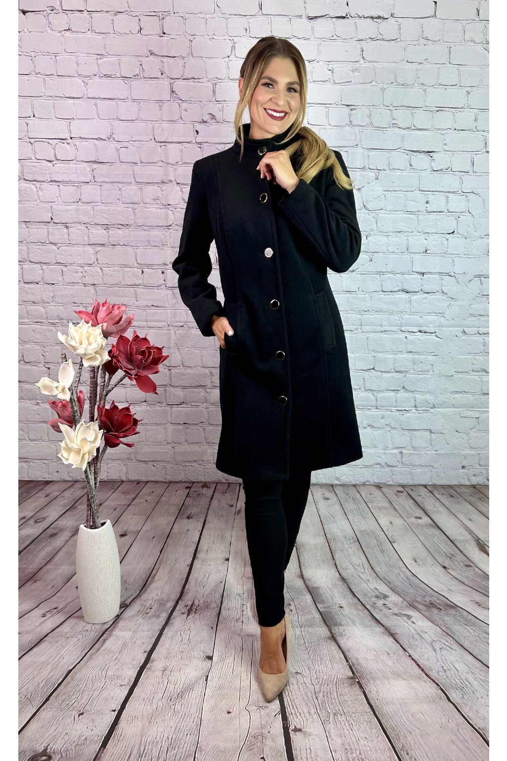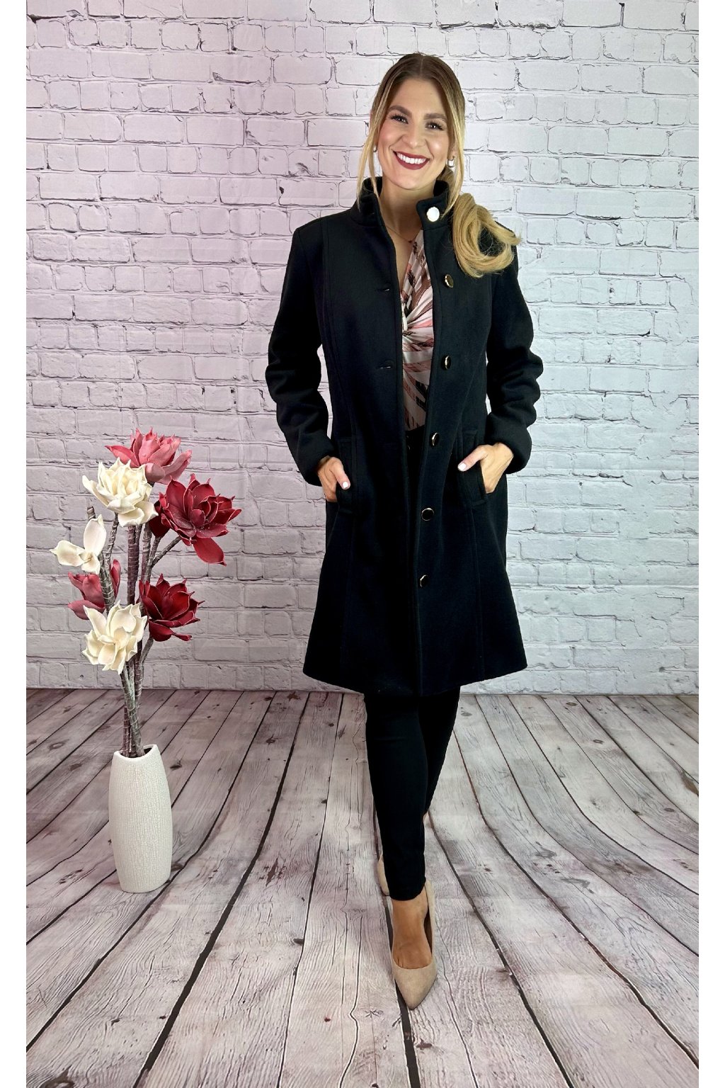 Čierny flaušový kabát na gombíky. Ideálny kúsok na zimu. Gomíbky sú po celej dĺžke, vrecká po stranách.