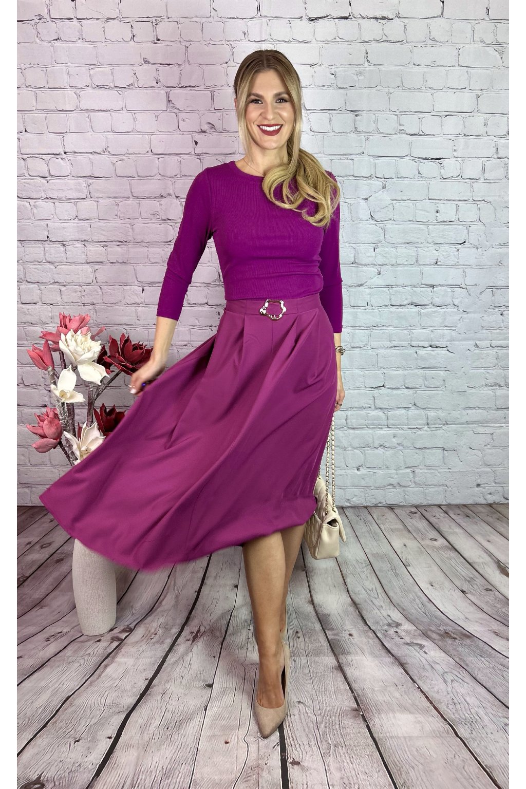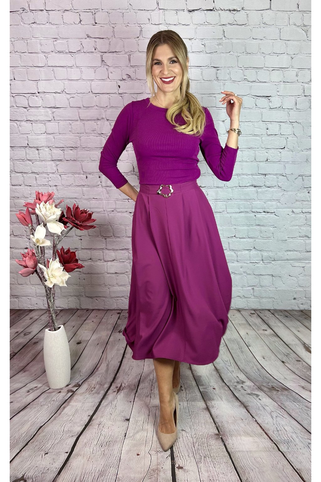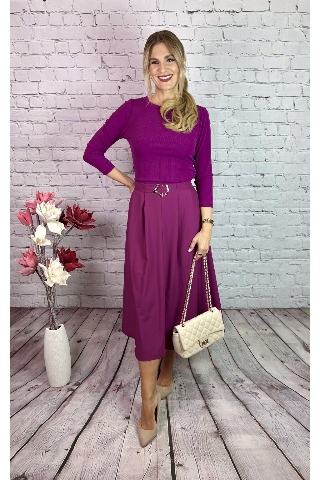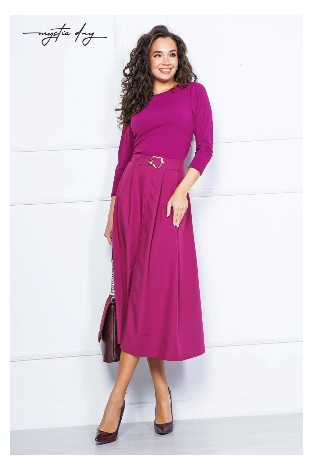 Cyklaménové MIDI šaty A-strihu. Strihané v páse, vršok šiat je z príjemného vrúbkovaného elastického materiálu Súčasťou šiat ozdobná spona v páse. Materiál je mierne elastický, šaty majú zapínanie na bočnej strane.