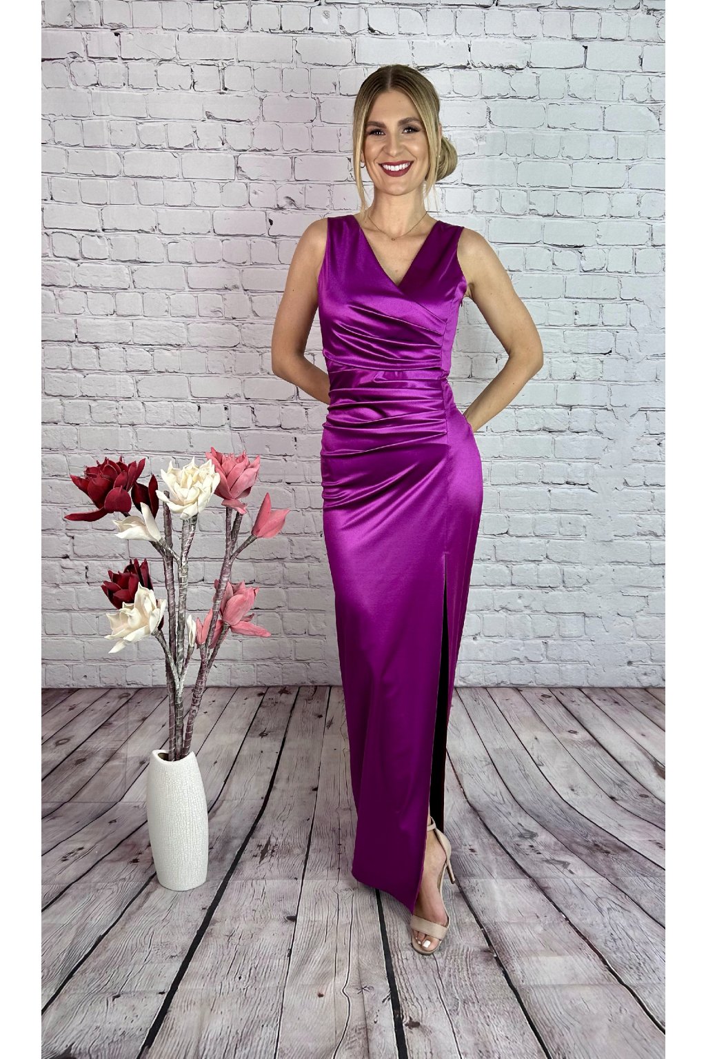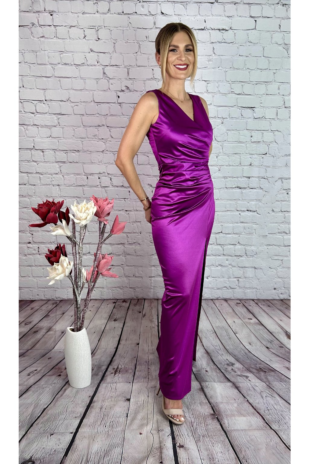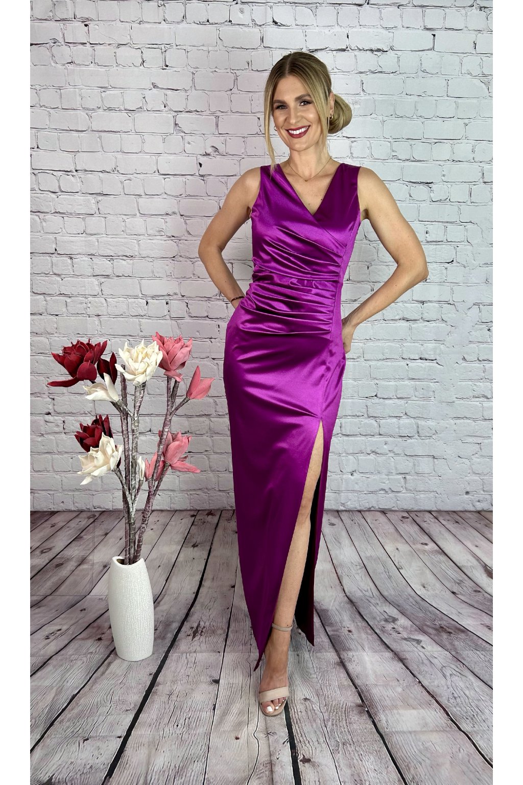 Dlhé príležitostné šaty na hrubšie ramienka, s rázporkom na ľavej strane, riasenie v oblasti bruška. Látka je saténového vzhľadu, minimalne elastická. Krásne kopírujú a zvýrazňujú postavu, zips majú na zadnej strane.