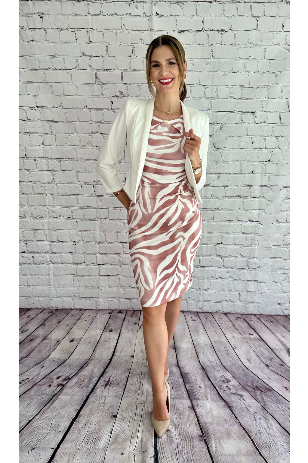Farebné vzorované šaty v puzdrovom strihu, vpredu jemne nazberané. Šaty sú vhodné na akúkoľvek príležitosť , pekne sa kombinujú aj s bolerkom. Zapínanie vzadu na zips.
