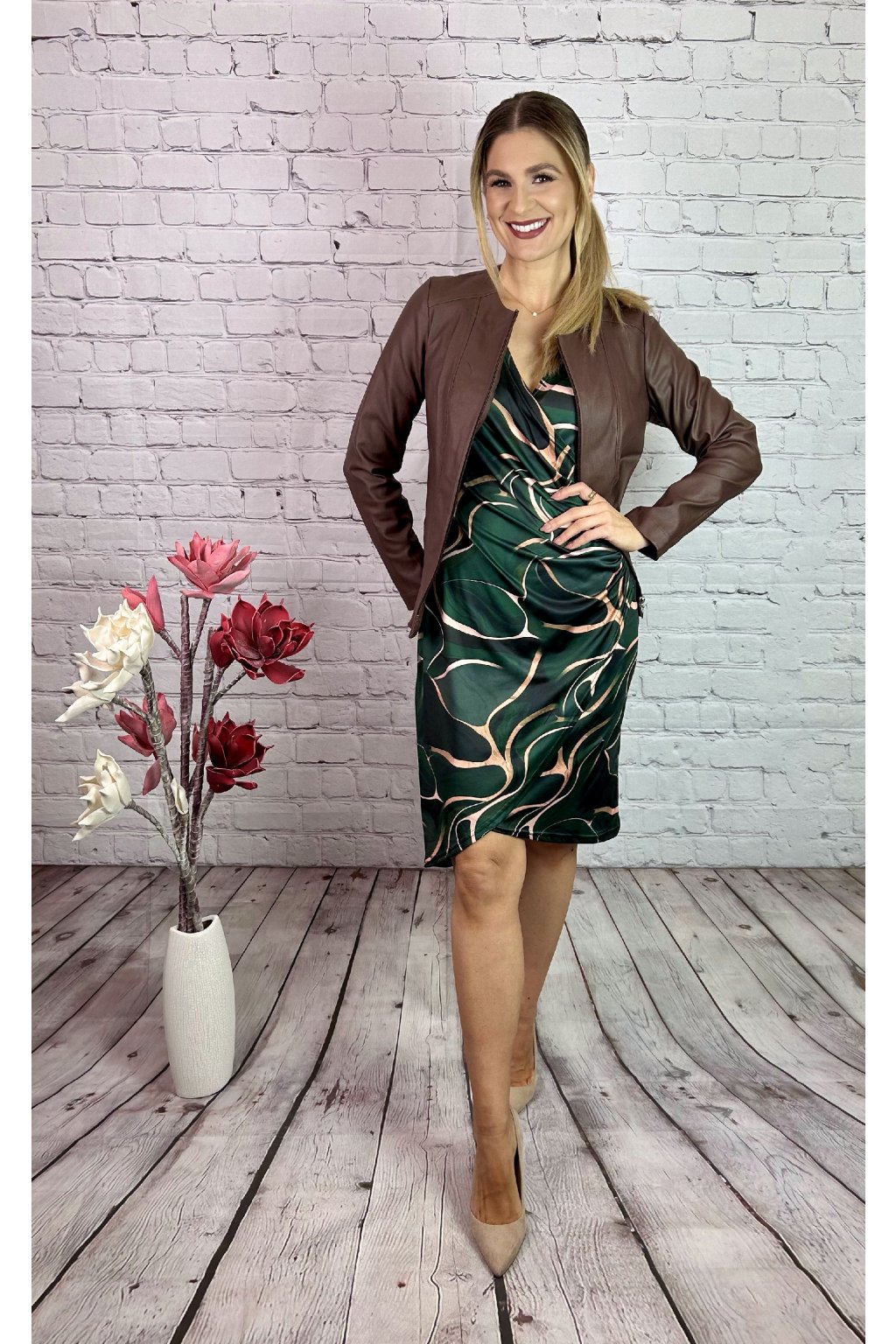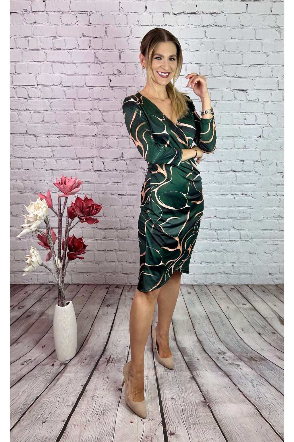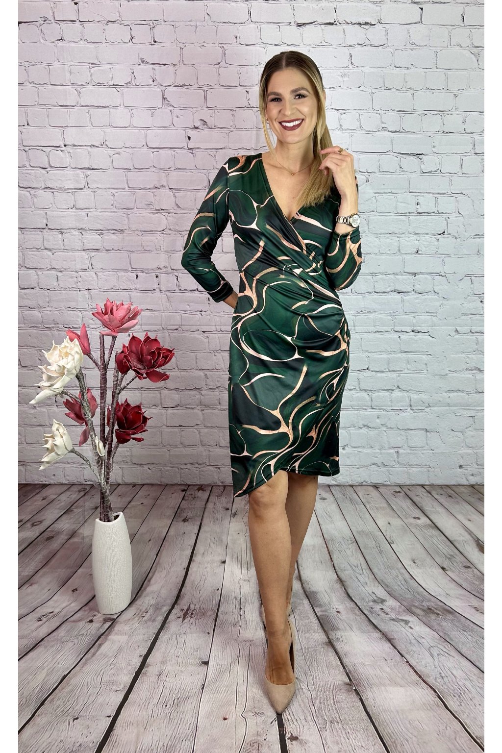 Zelené vzorované šaty v puzdrovom strihu, vpredu nazberané, maskujúci efekt. Šaty sú vhodné na akúkoľvek príležitosť. Materiál je elastický.