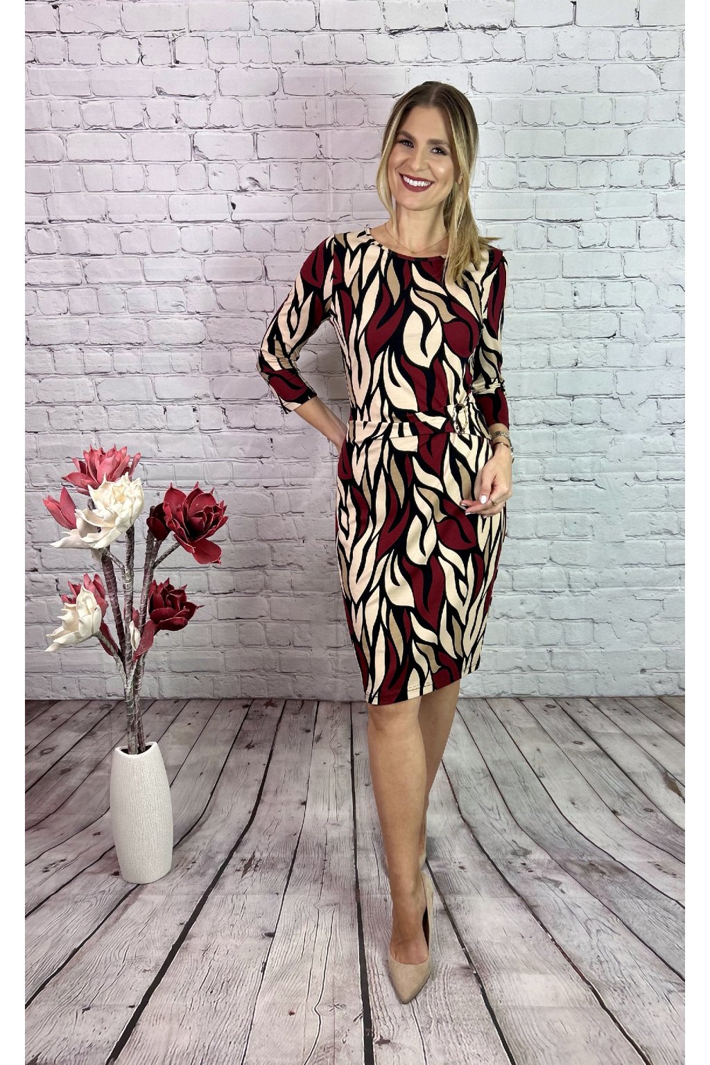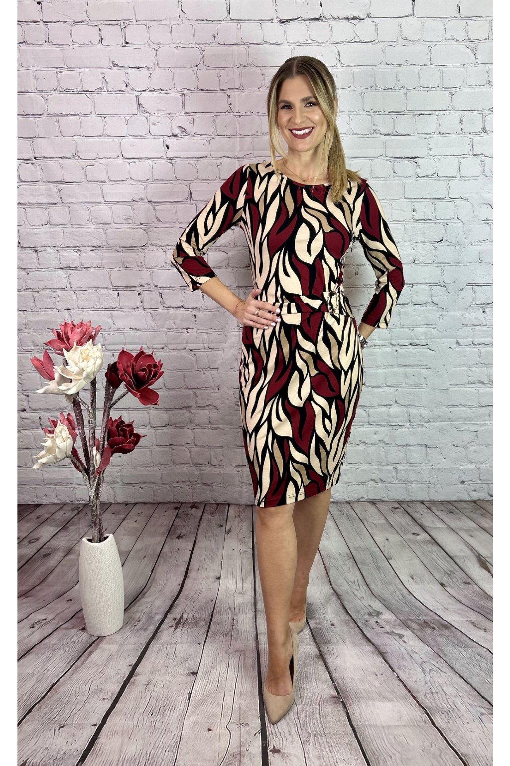 Farebné šaty v puzdrovom strihu, vpredu jemne nazberané, maskujúci efekt. V páse je ozdobná spona. Šaty sú vhodné na akúkoľvek príležitosť a skvelo sa kombinujú s koženkovou bundičkou z našej kolekcie. Materiál je elastický.