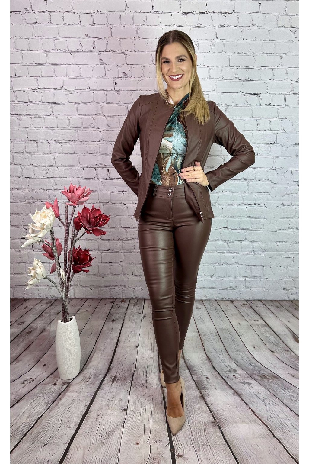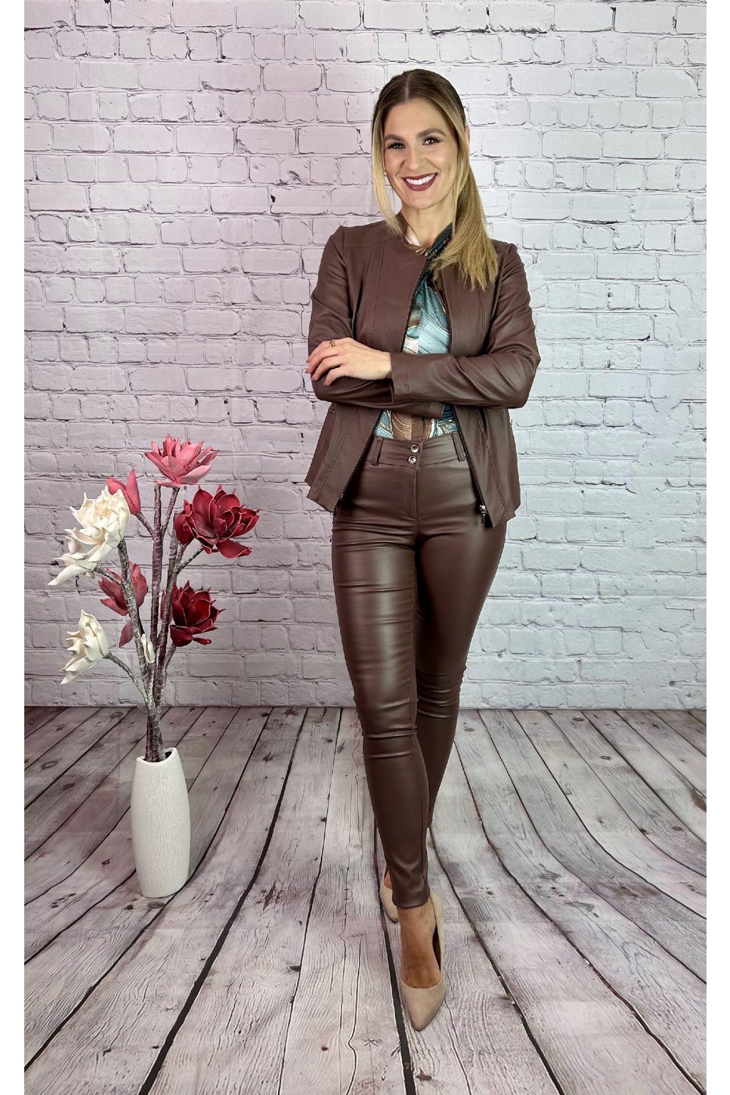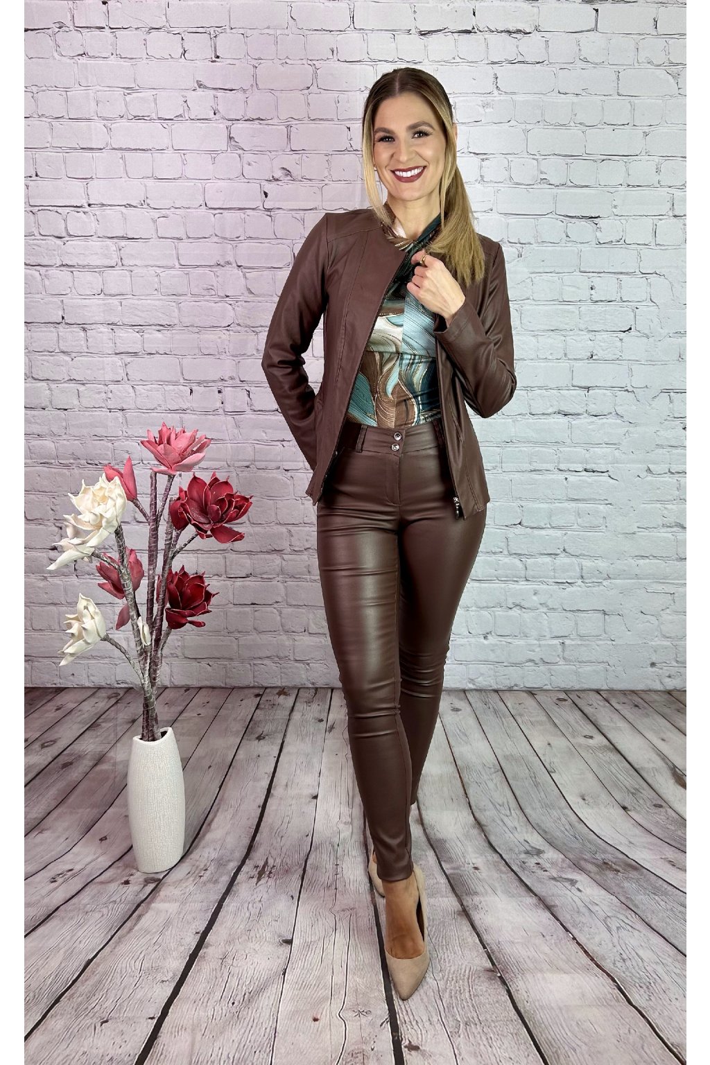 Štýlová koženková bundička hnedej farby. Ideálna v kombinácii s nohavicami alebo šatami z našej kolekcie. Materiál je mierne elastický, zapínanie na zips. Bundička je užšieho strihu.