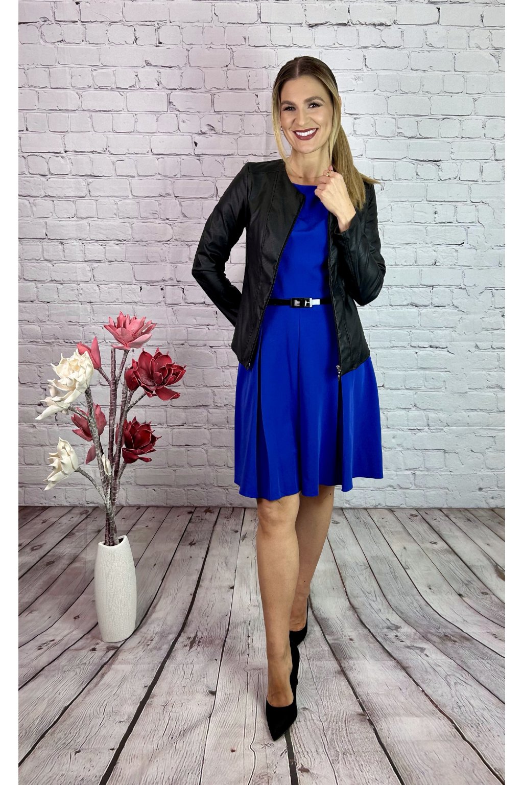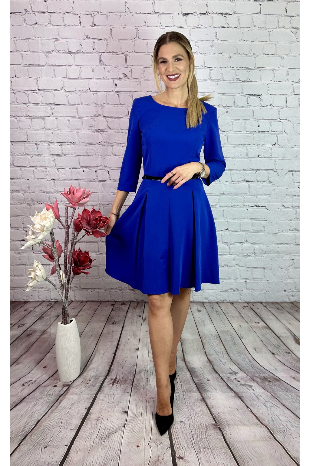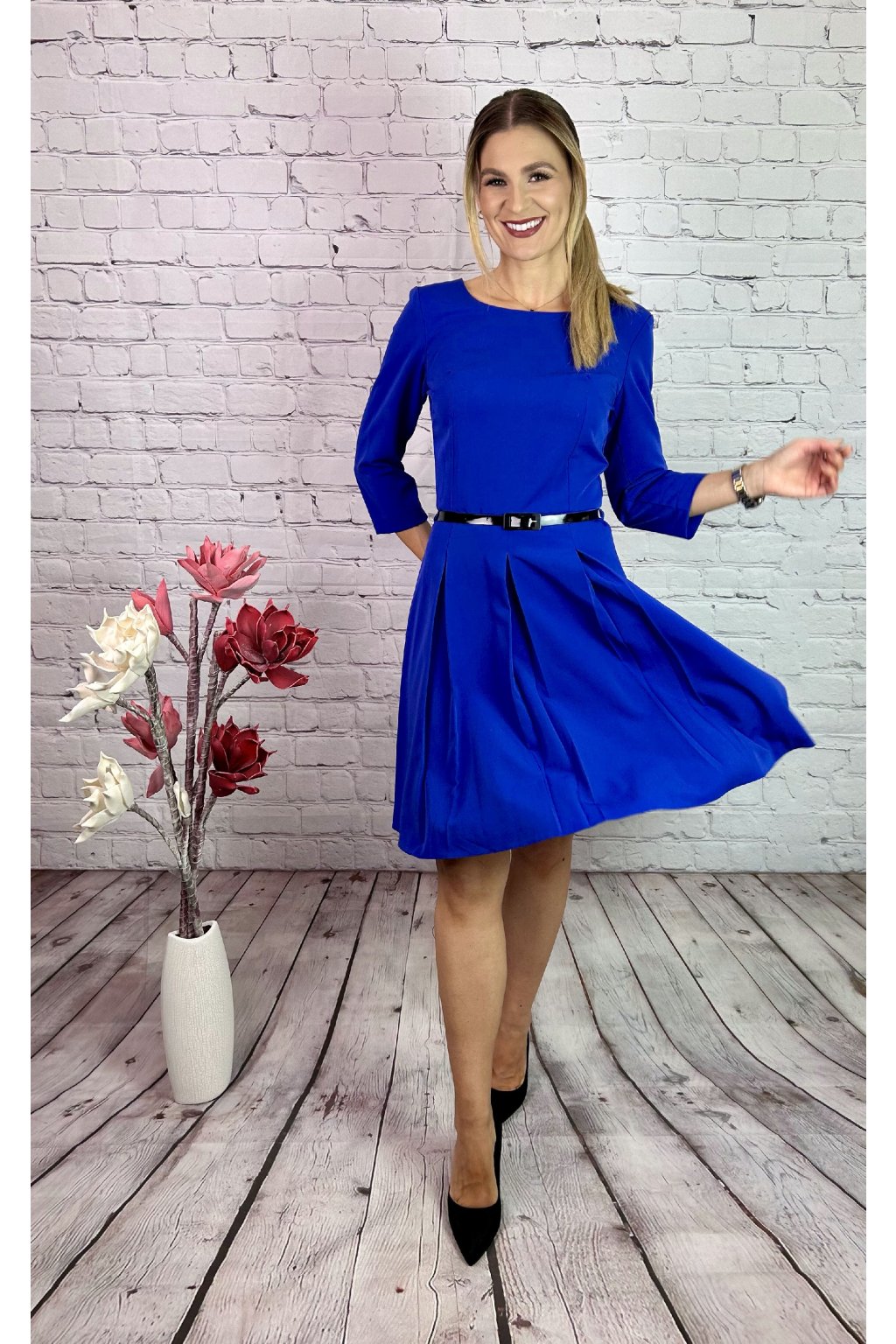 Kráľovsky-modré šaty A-strihu s rukávom, materiál je mierne elastický. Zapínanie v zadnej časti na zips. Súčasťou šiat je aj opasok. Šaty sú vhodné na akúkoľvek príležitosť. Šaty sa veľmi dobre kombinujú s bundičkou z našej kolekcie.
