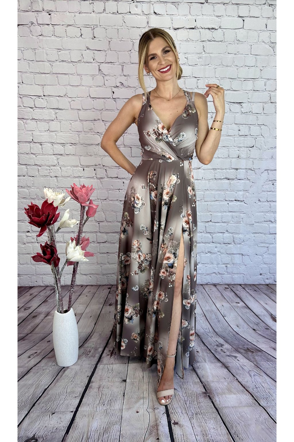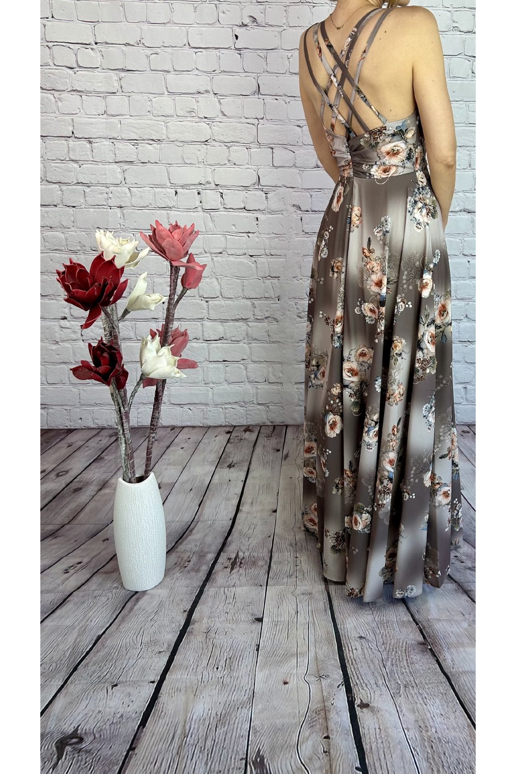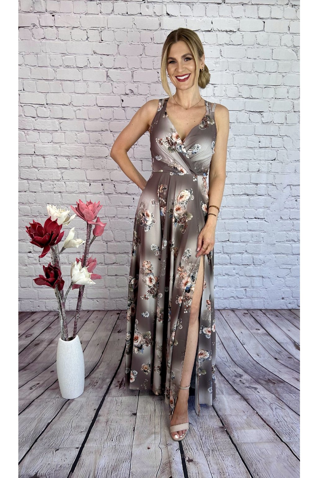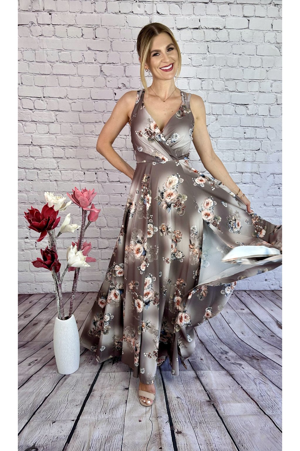 Kvietkované tmavohnedé dlhé letné šaty