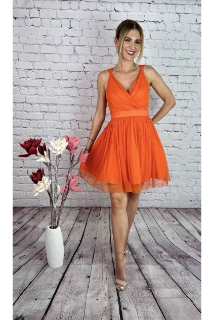Oranžové krátke trblietavé šaty na ramienka so šifónovou sukničkou