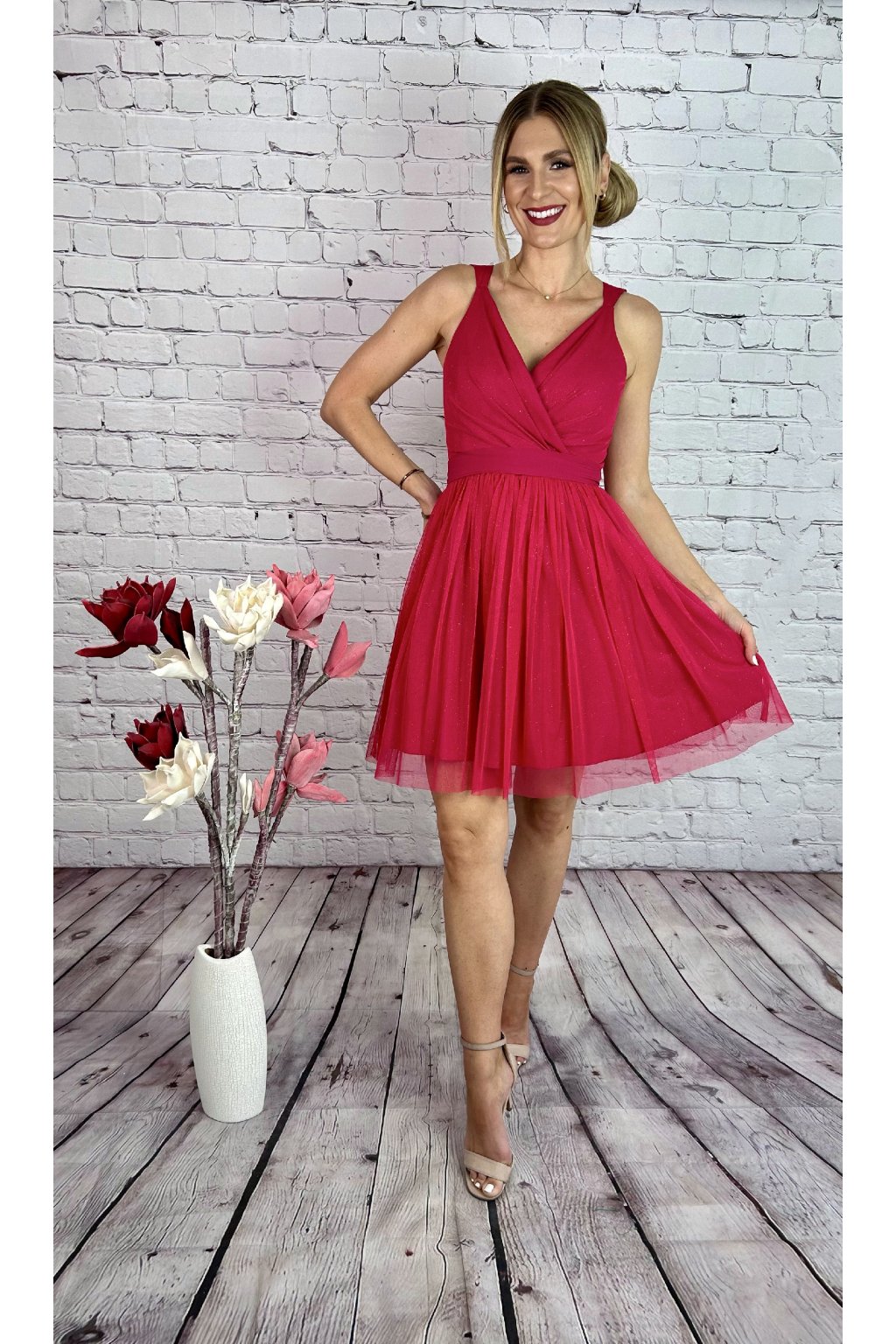 Malinové krátke trblietavé šaty na ramienka. Suknička do A-strihu, strihané v páse. Šaty majú viazanie v páse.
