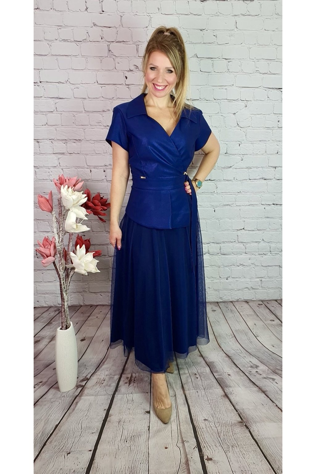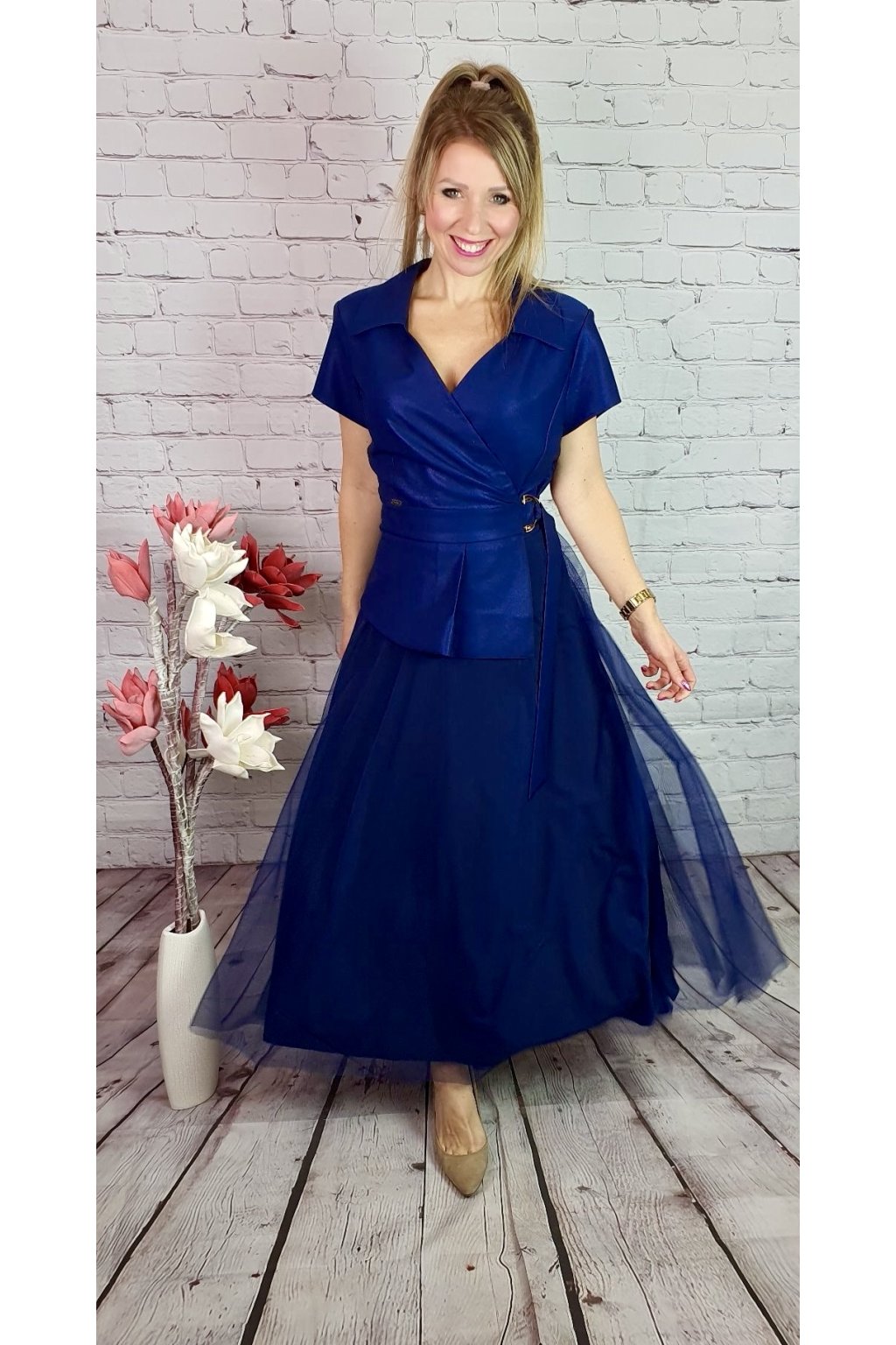 Modré jemne trblietavé šaty so zlatým odleskom, A-strihu s jemnou tylovou sukňou. Nádherné, vznášajúce, ženské. Tieto šaty nie sú len kúskom vášho šatníka, je to skutočný zážitok na nosenie. Perfektná voľba na slávnostné príležitosti.