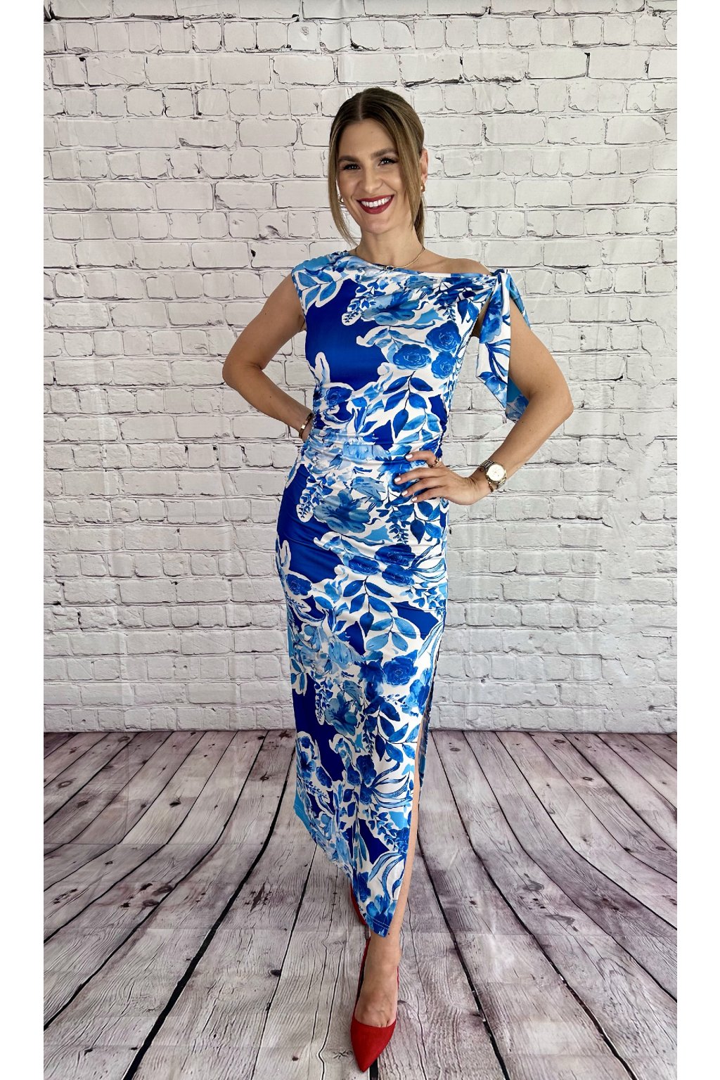 Modré dlhé priliehavé šaty na krátky rukáv s viazaním na jednej strane. Výrazný farebný vzor, šaty sa perfektne kopírujú postavu, materiál je elastický. Rázporok na ľavej strane.