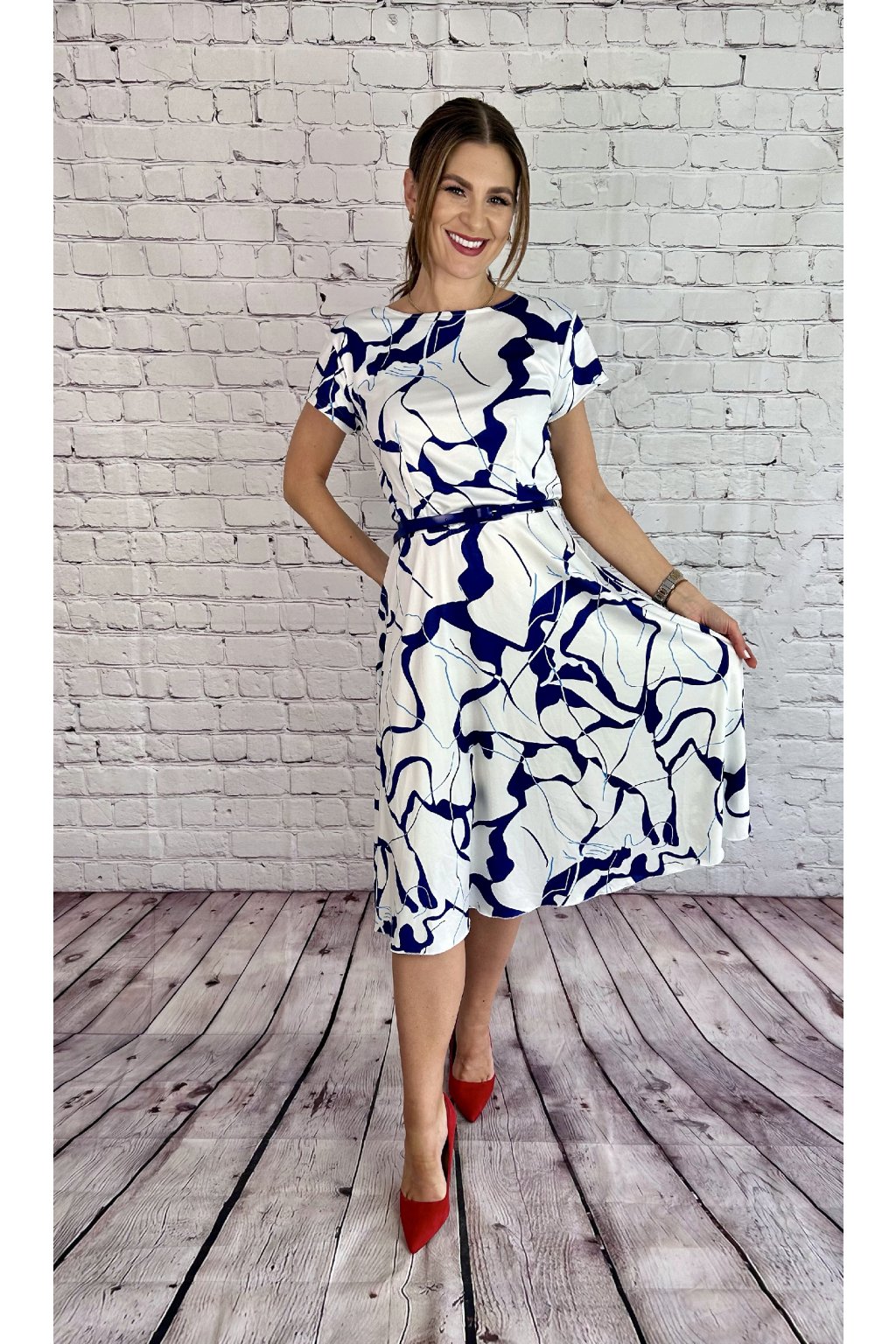 Modrobiele vzorované šaty na krátky rukáv s modrým opaskom. Materiál je elastický. Šaty sú strihnuté v páse, na gumičku, pohodlná padavá suknička.