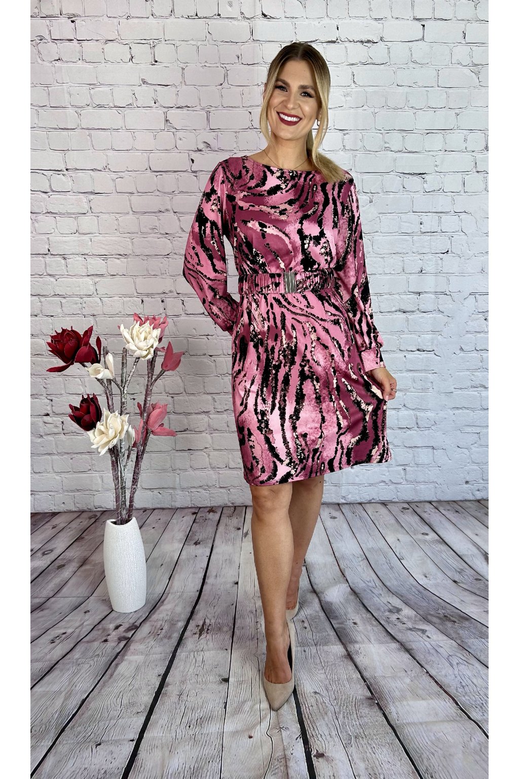 Ružové vzorované šaty voľného strihu s opaskom