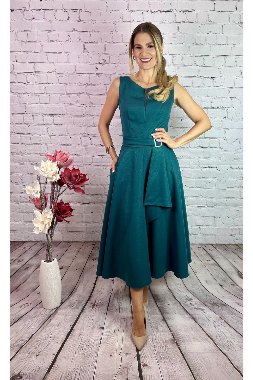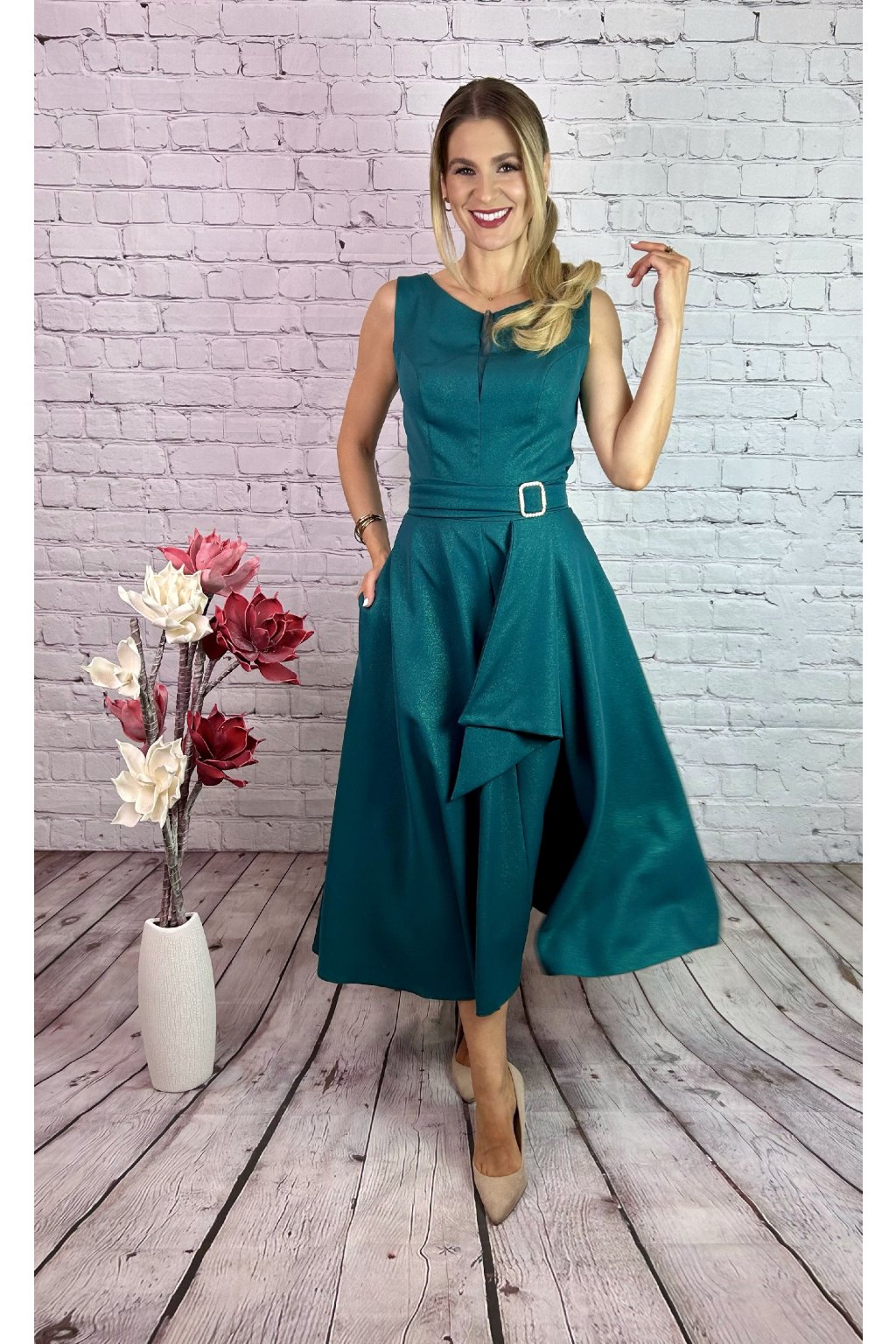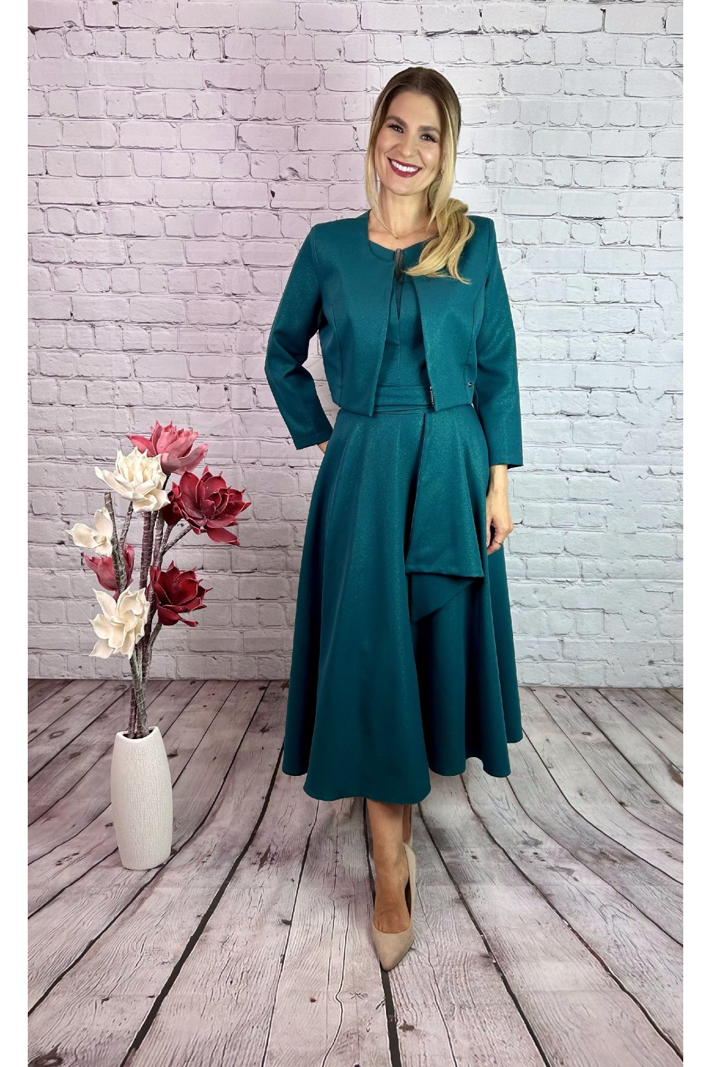 Smaragdovo-zelený kostým. Šaty v MIDI dĺžke v vreckami po bokoch a ozdobnou perličkovou sponou. Kabátik je v štýle bolerka. Materiál nie je elastický, s jemným trblietavým odleskom.