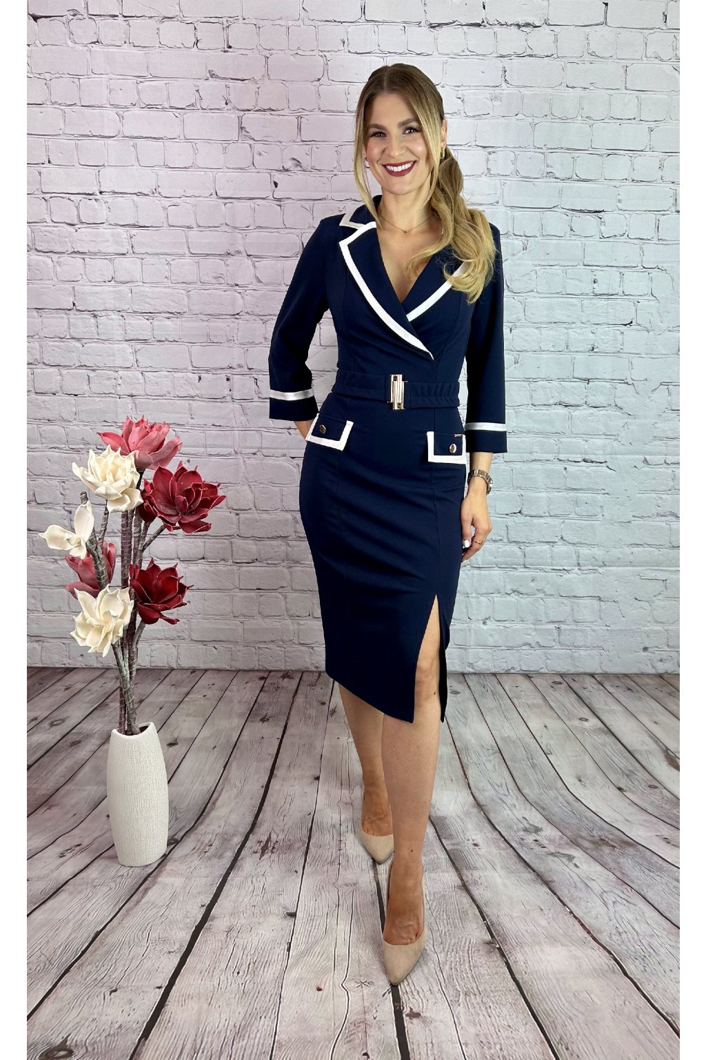 Modré priliehavé šaty s rázporkom a opaskom. Detail, ktorý zaujme na prvý pohľad je biely lem na golieriku a rukávoch. Šaty perfektne kopírujú postavu, materiál je elastický. Opasok je súčasťou šiat, zapínanie vzadu na zips.