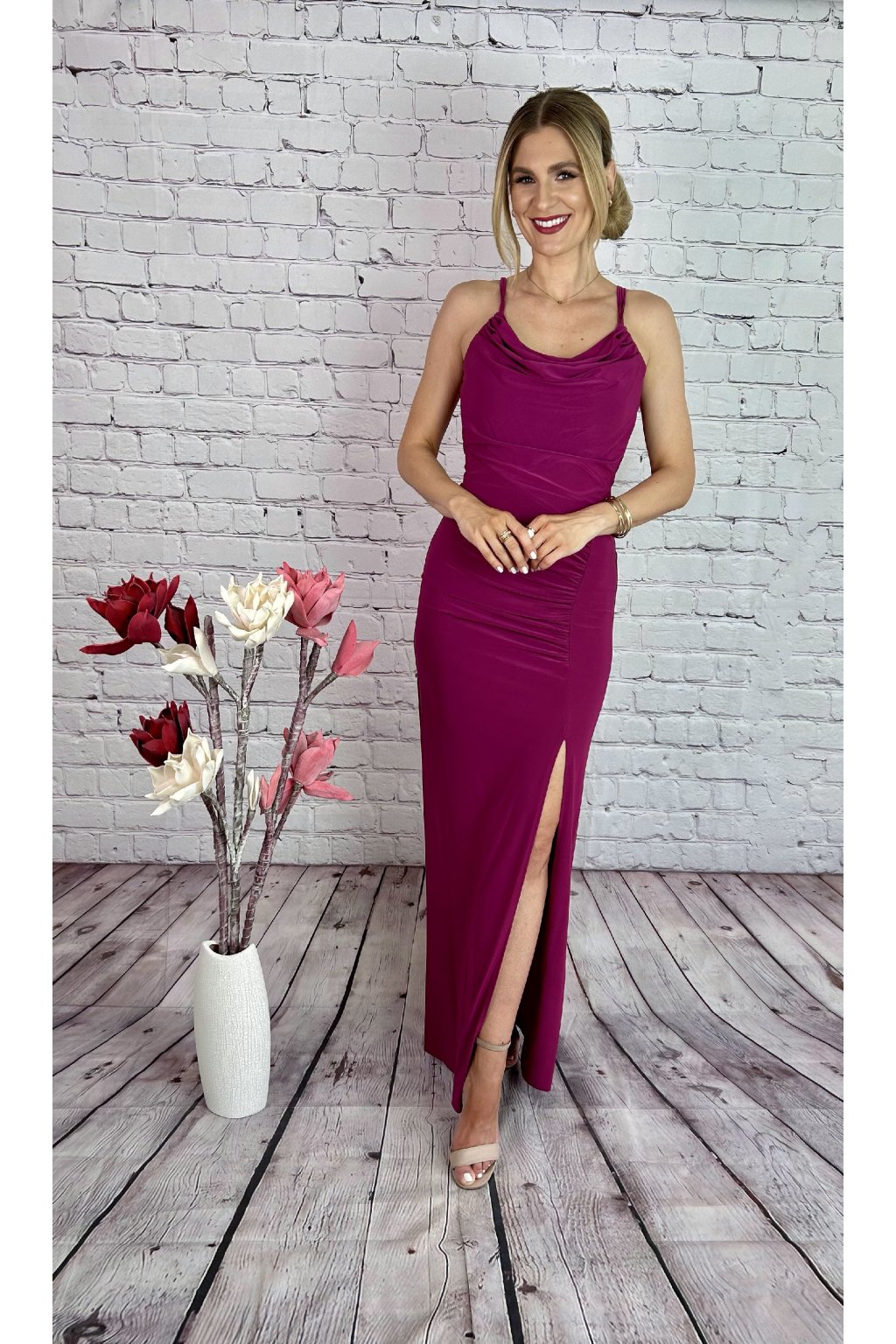 Dlhé príležitostné šaty na ramienka,  s rázporkom na ľavej strane. Materiál je elastický, krásne kopírujú a zvýrazňujú postavu, zips na zadnej strane.