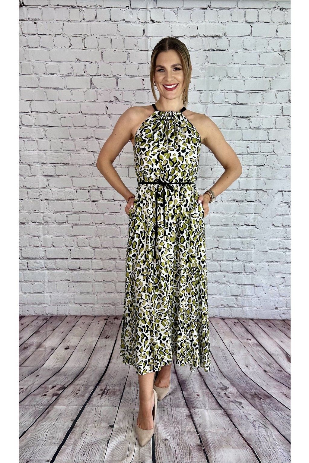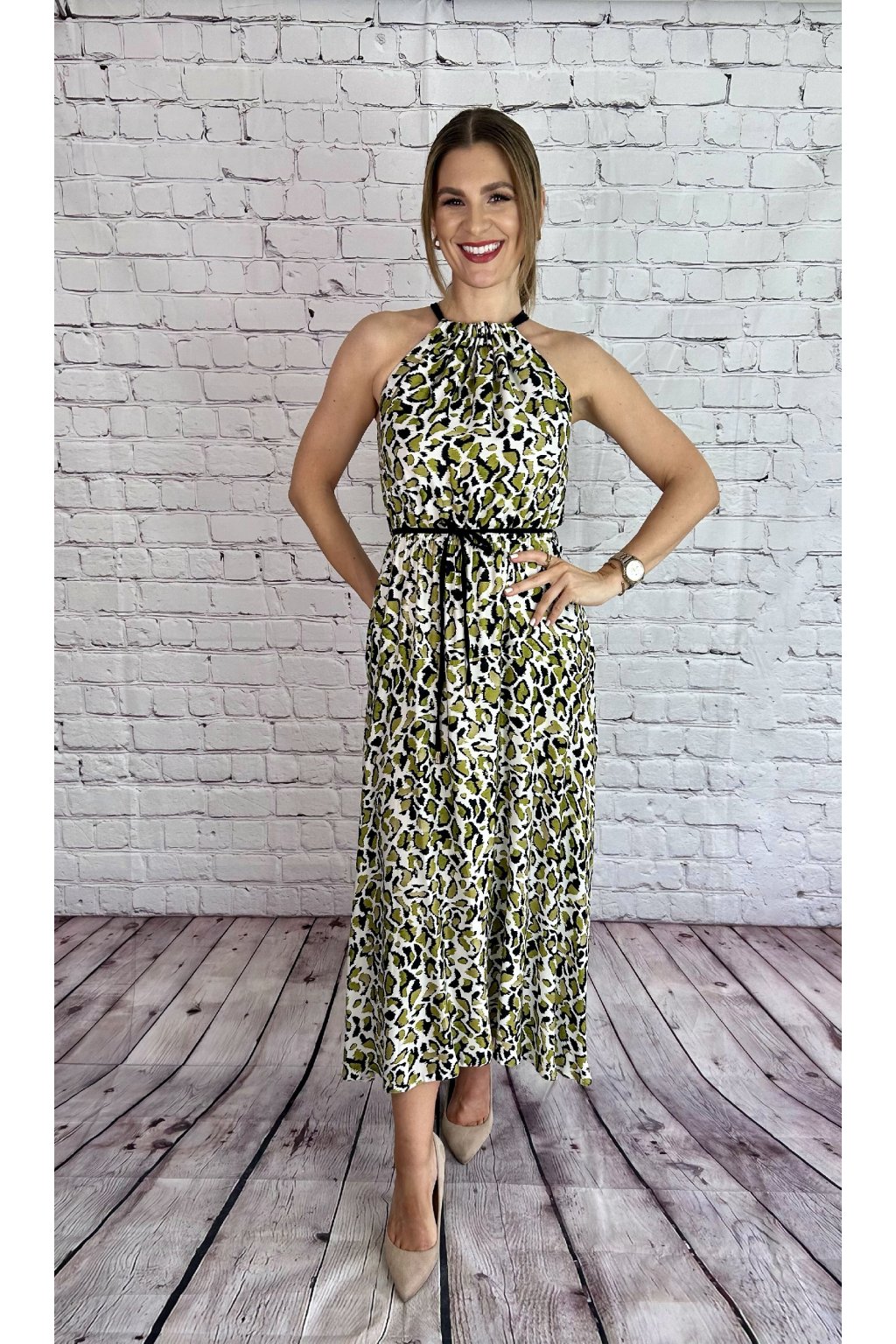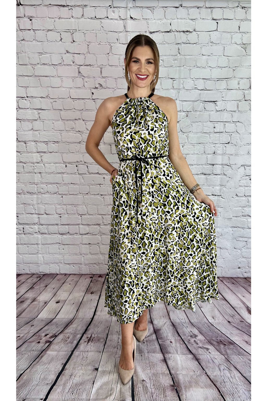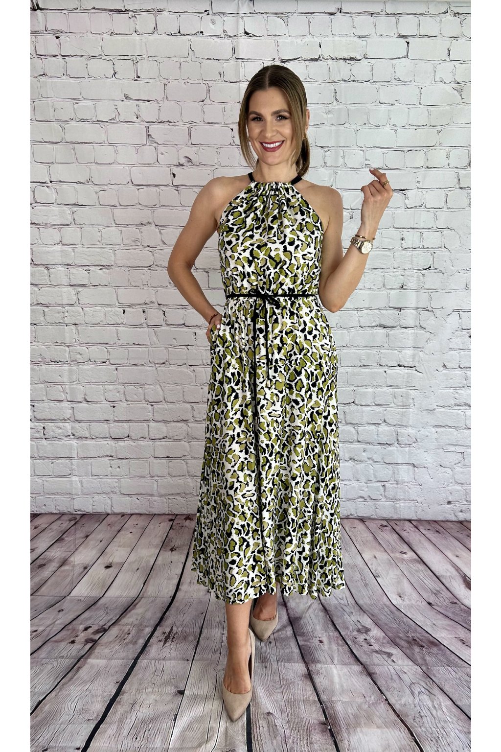 Zelené dlhé šaty s leopardím vzorom, materiál je elastický. Šaty skvelo sedia na postave, nastaviteľné viazanie okolo krku. Suknička je v spodnej časti asymetrická, gumička a viazanie v páse. Perfektný kúsok na letné dni.